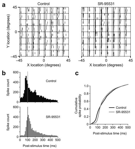 Figure 4. Effects of GABAA receptor blockade on baseline receptive field properties. (a) Receptive field raster plots from untrained cells illustrating the effect of SR-95531 application on response properties. Across different receptive field locations a control cell tended to show greater variability in the times of visually evoked spikes, whereas spikes in a SR-95531 cell tended to occur at similar times following the stimulus and during a relatively short time window. (b) Consistent with the examples in a, there were significant differences in the timing of stimulus-evoked action potentials between control and SR-95531 conditions. Comparing spike-time histograms for all responses of all cells in the two groups showed that the onset of responses in SR-95531 cells tended to be later and all spiking occurred over a narrower time window than in control cells. (c) Examination of the cumulative distribution functions for these spike-time distributions showed a highly significant difference in spike timing between the two groups (P < 0.001, Kolmogorov-Smirnov test).