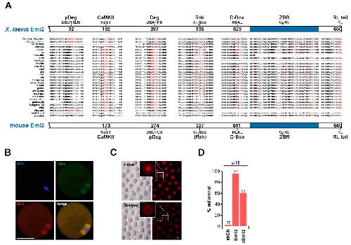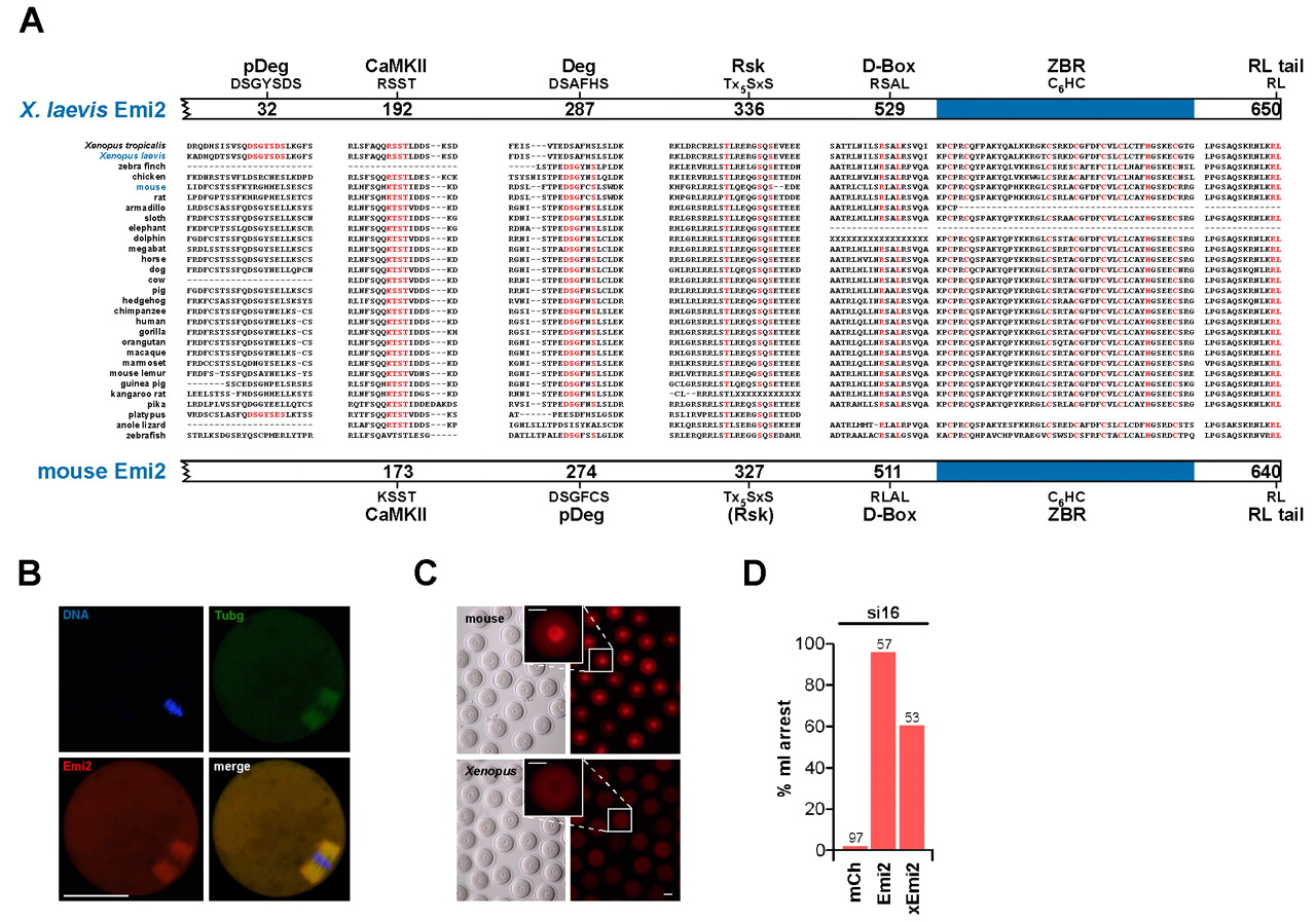 Features of Emi2 species orthologues. (A) Optimized alignment of regions of Emi2 from different species showing positional correspondence to functional domains and residues (red) in Xenopus laevis xEmi2. (p)Deg, (phospho)degron. (B) Fluorescence images after GV oocyte injection with cRNA encoding Emi2-mCherry in the IVM16 system (see Fig. S1B in the supplementary material), showing Emi2spindle localization. Tubg, γ-Tubulin. DNA is stained with DAPI. (C) GV oocytes injected with cRNA encoding full-length mouse or Xenopus Emi2 and held for 5 hours in IBMX prior to visualization. Insets show Emi2 nuclear localization in mouse, but not in Xenopus. (D) Percentages of mI arrest following GV oocyte injection with cRNA encoding mCherry (mCh), Emi2 or xEmi2 in the si16 system (see Fig. S1C in the supplementary material). Scale bars: 50 μm.