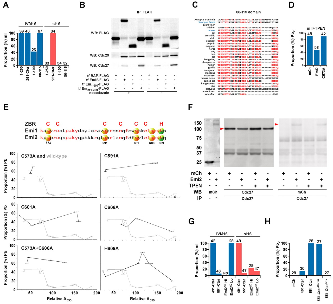 Mouse Emi2 comprises separable functional domains. (A) Percentages of oocytes arrested at mI in the IVM16 or si16 systems (see Fig. S1B,C in the supplementary material) following injection with cRNAs encoding different Emi2 constructs. Values below the x-axis correspond to Emi2 residue numbers. (B) Immunoblotting of lysates from NIH 3T3 cells transfected (tf) as indicated, in the presence or absence of nocodazole, and subjected to anti-FLAG immunoprecipitation (IP) with beads to capture complexes containing FLAG (uppermost), or endogenous Cdc20 (centre) or Cdc27. (C) Optimal species alignment with mouse Emi2 residues 80-115. Residues that are identical in more than 50% of the sequences are shown in red. (D) Intact mII oocytes were injected with cRNA encoding mCherry (mCh), Emi2-mCherry or Emi2C573A (C573A), exposed to TPEN (10 μM) after 4 hours then scored for Pb2 extrusion 1.5 hours later. (E) Alignment of parts of mouse Emi1 and Emi2 (with Emi2 residue numbering) ZBRs. Varying [cRNA] encoding Emi2 mutants were injected in the si16 system, and fluorescence quantified (x-axis) and plotted against the proportion emitting a Pb (average 14.8 oocytes/point). The wild-type Emi2 profile is shown on each plot for comparison (grey). (F) Western blotting of lysates from NIH 3T3 cells transfected with mCherry or Emi2-mCherry (Emi2) (leftmost) and following IP to capture endogenous Cdc27. Red arrowheads mark complexes containing Cdc27 (left) and Emi2-mCherry. Cells were incubated in 100 μM TPEN prior to collection as indicated. (G) cRNAs encoding Emi2491-Cter (491-Cter), Emi2551-Cter (551-Cter) or Emi2δD (D-box double mutant, R511A, L514A) injected in the IVM16 or si16 systems, showing the percentage arrested at mI. Low (Lo) and high (Hi) RNA concentration are, respectively, 0.5-1.0 and 2.0-2.5 mg/ml; the Lo value corresponds to the default used in other experiments. (H) Mature mII oocytes injected with cRNA encoding mCherry (mCh), Emi2491-Cter (491-Cter), or Emi2551-Cter (551-Cter) or Emi2551-Cter containing the mutations indicated were scored for mII exit as indicated by Pb2 emission 2 hours post-injection. Values above columns show oocyte numbers. Emi2 constructs were all expressed as mCherry fusions.