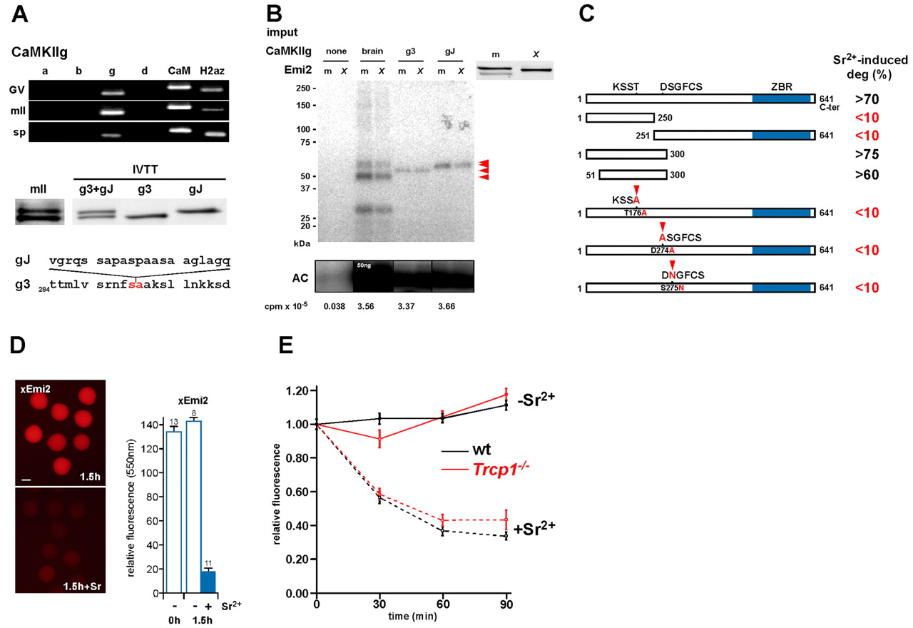 Molecular regulation of mII exit by Emi2. (A) Agarose gel electrophoresis of RT-PCR (top) detects transcripts for CaM and the CaMKII γ isoform (g), but not α, β or δ (a, b and g) in sperm (sp) or oocytes (GV and mII). Immunoblotting (centre) with anti-CaMKIIγ reveals two isoforms, γ3 and γJ, in mII oocytes, the variant sequences of which are shown below. IVTT, coupled in vitro transcription/translation. (B) SDS-PAGE of in vitro assays to measure phosphorylation of mouse Emi2 (m) and xEmi2 (X) produced in vitro, by CaMKIIγ mII oocyte isoforms (γ3 and γJ) produced in vitro (A) or a mixture of all CaMKII isoforms from bovine brain (brain). AC, positive control autocamtide peptide. Red arrowheads indicate autophosphorylated CaMKII monomers. (C) Data summary of ectopic Emi2 degradation following oocyte activation. mII oocytes injected with cRNA encoding mCherry fused to Emi2, or the Emi2 mutations indicated were exposed to 10 mM SrCl2 (see Fig. S1D in the supplementary material) and fluorescence levels recorded 1 hour after SrCl2 withdrawal. Complete data sets are presented in Fig. S10A,B in the supplementary material. (D) Fluorescence images (left) and histograms for mII oocytes injected with cRNA encoding xEmi2-mCherry (xEmi2), without (top) or with exposure to SrCl2 as in C. Recordings were made at the times indicated after oocytes had been exposed to SrCl2 for 1.5 hours. Scale bar: 50 μm. Values above columns show oocyte numbers. (E) Fluorescence levels in mII oocytes injected with cRNA encoding Emi2-mCherry and 4 hours later treated with 10 mM SrCl2 (+Sr2+, broken lines) or not treated (âSr2+, solid lines). Oocytes were from the hybrid B6D2F1 (black plots, wt) or homozygous null Trcpb1â/â mutants (red).