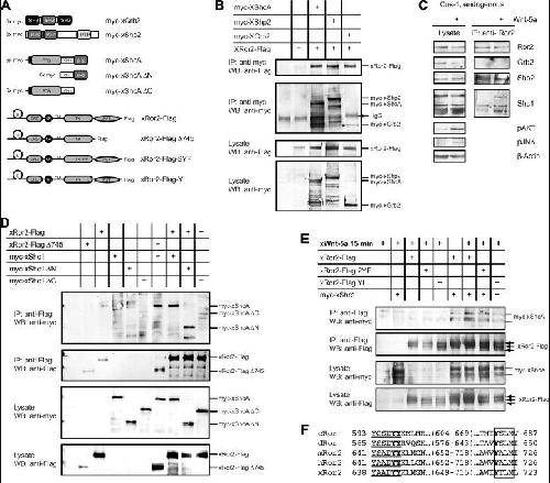 Fig. 2. SH2-domain proteins bind to xRor2. (A) Schematic illustration of xGrb2, xGab1, xShp2, xShcA and xRor2 constructs used for co-immunoprecipitation. (B) myc-tagged xShcA (NCBI NM_001090463), xShp2 (NCBI BC073687), and xGrb2 (NCBI AJ223061) were co-expressed with xRor2-Flag in Cos-1 cells. All proteins co-immunoprecipitated with xRor2-Flag without Wnt-5a stimulation. (C) Endogenous Ror2 was immunoprecipitated from Cos-1 cells stimulated with control CM and Wnt-5a CM for 15 min and co-immunoprecipitation of endogenous proteins was detected by immunoblotting. Activation of PI3K and JNK was monitored by AKT and JNK phosphorylation. (D) Co-immunoprecipitation of xShcA and xRor2 in Cos-1 cells: xShcA bound equally well to FL xRor2 and to xRor2Î745. xShcAÎN, lacking the PTB-domain, was still able to bind to xRor2, but xShcAÎC, lacking the SH2-domain, failed to do so. (E) Co-immunoprecipitation of xShcA and xRor2 in HEK 293 cells was induced by xWnt-5a stimulation. Mutation of Y642 and Y643 (xRor2-Flag 2YF) moderately, mutation of Y719 (xRor2-Flag-YL) strongly reduced binding of xShcA to xRor2. Arrows indicate xRor2-Flag bands. (F) Conserved tyrosine residues mutated in xRor2-Flag 2YF and xRor2-Flag-YL are indicated in bold type, the conserved Shc-SH2 binding motif is boxed, the motif described as required for activation of the related RTK TrkA [23] is underlined. The respective regions of C. elegans Ror (Cam-1, NCBI NP_001021907.1), Drosophila melanogaster Ror (AAF52885), human (NCBI NP_004551.2) and mouse Ror2 (NCBI NP_038874.3) are aligned with the xRor2 sequence (NCBI NP_001082312); numbers indicate the respective amino acid. |