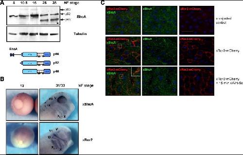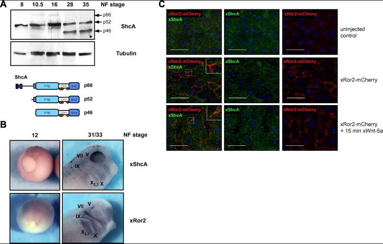 Fig. 3. xShcA is co-expressed and co-localizes with xRor2. (A) Western blotting of Xenopus embryo lysates showed expression of only p52 xShcA until neurula stages; in tadpole stages (NF stage 28 and 35) also p46 xShcA was detected. Schematic illustration of the three ShcA isoforms p66, p52 and p46. (B) Whole mount in situ hybridization for xShcA and xRor2 at NF stage 12 and 31/33. Cranial ganglia and nerves are labeled as follows: V = profundal-trigeminal, VII = facial, IX = glossopharyngeal, X = first vagal, X2,3 = second and third vagal. (C) Immunostaining for endogenous ShcA showed largely membrane proximal localization of the protein. In Animal Caps injected with 60 pg xRor2-mCherry RNA, xRor2-mCherry protein weakly co-localized with xShcA at the cell membrane without exogenous ligand. xWnt-5a stimulation induced clustering of xRor2-mCherry and strongly enhanced co-localization with endogenous xShcA. |