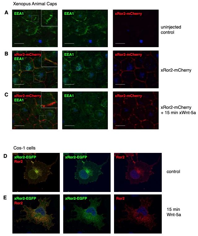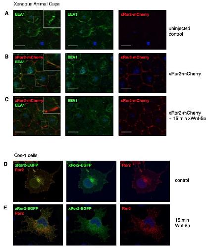 Supplementary Fig. 1. xRor2-mCherry does not co-localize with the early endosomal marker EEA1 in Xenopus Animal Caps. (A) Immunostaining for endogenous EEA1 labeled membranes and submembraneous early endosomal vesicles. (B) In Animal Caps injected with 60 pg xRor2-mCherry RNA, xRor2-mCherry protein co-localized with EEA1 at the cell membrane. (C) xWnt-5a stimulation induced formation of larger clusters and vesicle-like structures of xRor2, but those did not co-localize with EEA1, indicating that these do not represent endosomes. (D) xRor2-EGFP overexpressed in Cos-1 cells co-localized with endogenous Ror2 in serum-starved control cells. (E) Wnt-5a stimulation (100 ng/ml) enhanced this co-localization. |