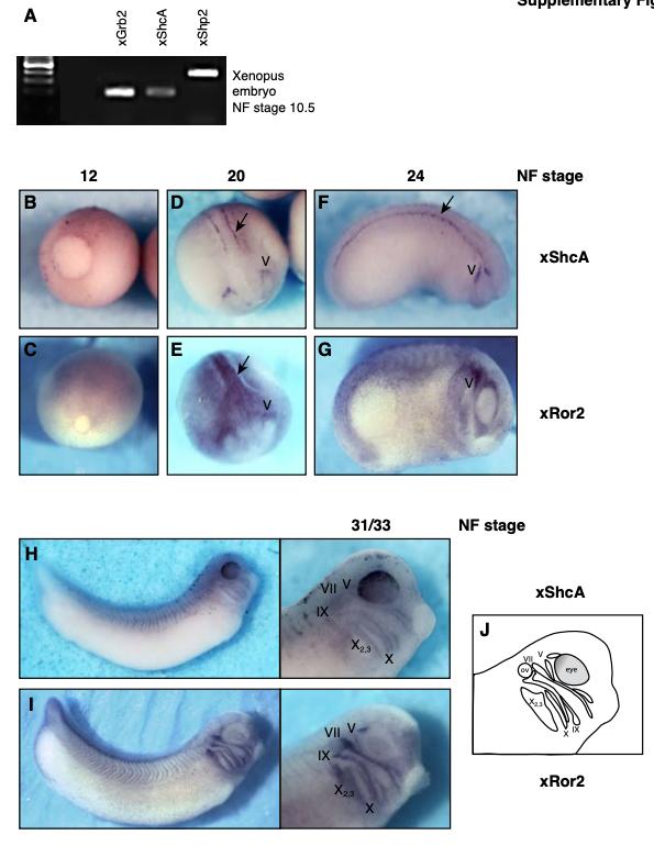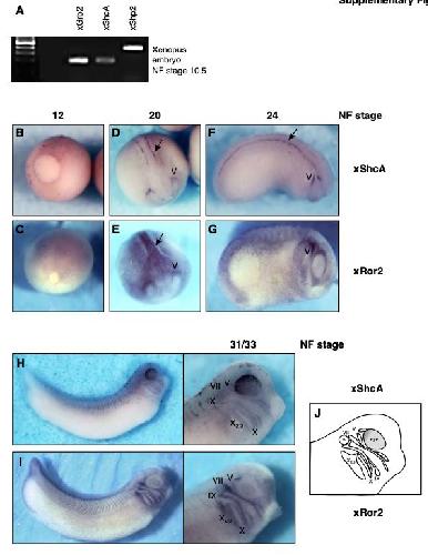 Supplementary Fig. 2. (A) Expression of the phospho-tyrosine binding RTK adapter proteins xGrb2, xShcA, and xShp2 at early gastrula stage Xenopus embryos (NF stage 10.5) was confirmed by RT-PCR. Whole mount in situ hybridization for xShcA and xRor2 at NF stage 12 (B and C), 20 (D and E), 24 (F and G) and 36 (H and I). Structures showing overlapping expression include the spinal chord (arrow) at stage 20 and 24, cranial ganglia V (trigeminal) from stage 20 onward, VII (facial) from stage 24 onward, IX (glossopharyngeal), X (first vagal) and X2,3 (second and third vagal) at stage 31/33. O = otic vesicle; also illustrated in the schematic drawing. At stage 20 xShcA was expressed in the profundal and trigeminal ganglion (cranial ganglion V) and the spinal chord; xRor2 was also detected in these structures but overall showed a broader expression including also the neural tube, brain and neural crest. At stage 24, xRor2 expression was maintained in the migrating neural crest and became more pronounced in the profundal and trigeminal ganglion, which also expressed xShcA. Expression of xShcA in the spinal chord continued till tadpole stages. At tadpole stages, both xShcA and xRor2 were expressed in all cranial ganglia including ganglia V, VII (facial ganglion), IX (glossopharyngeal ganglion), X and X2,3 (first, second and third vagal ganglion, Supplementary Fig. 2H and I). A schematic drawing illustrating the positions of cranial ganglia in Xenopus is shown in Supplementary Fig. 2J (modified after {Schlosser, 2000 #1037}. |