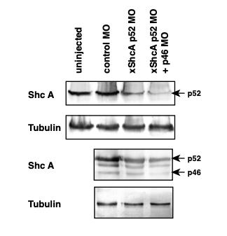 Supplementary Fig. 3. Injection of 2 pmol xShcA p52 MO or a combination of 2 pmol each xShcA p52 + p46 MOs downregulated xShcA protein levels at gastrula stages (NF stage 11). At tadpole stages (NF stage 28) 2 pmol xShcA p52 MO selectively downregulated the p52 isoform, while the combination of both MOs (2 pmol each) reduced xShcA p52 and p46 protein levels. |