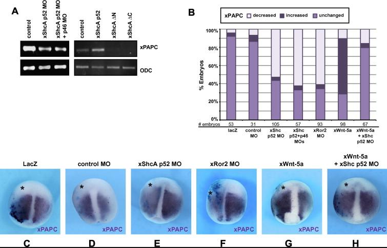 Fig. 4. xShcA is required for xRor2-dependent transcriptional regulation of xPAPC. (A) Injection of 2 pmol xShcA p52 MO or 2 pmol of each xShcA p52 and p46 MOs significantly downregulated xPAPC mRNA levels at NF stage 11. Overexpression of xShcA p52 (injection of 200 pg RNA) slightly upregulated xPAPC while overexpression of either xShcA p52 ÎN or xShcA p52 ÎC completely blocked xPAPC expression. (B) Statistical evaluation of xPAPC in situ hybridization. Embryos were injected in one dorsal blastomere and xPAPC staining on the injected (labeled with LacZ) side was scored relative to un injected side of the same embryo and the percentage of embryos showing enhanced, equal and reduced staining was calculated; the graph represents average values of at least three independent experiments (ââsignificantly different from LacZ and control MO, t-test, p > 0.99). (CâH) Representative images of embryos; injected side is to the left and labeled with an asterisk: LacZ (100 pg, C), control MO (2.7 pmol, D), xShcA p52 MO (2.7 pmol, E), xRor2 MO (0.8 pmol F), xWnt-5a RNA (100 pg, G) and xWnt-5a RNA + xShcA p52 MO (100 pg + 2.7 pmol, H). |