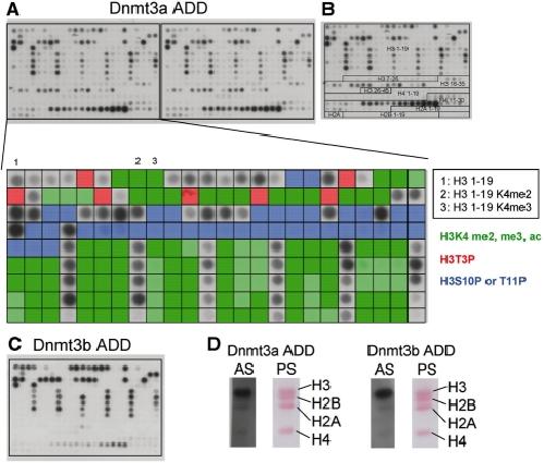 Figure 1. Binding of the Dnmt3a and Dnmt3b ADD domains to peptide arrays and native histones. (A) Binding of Dnmt3a ADD domain to peptide arrays comprising 384 different peptides. The enlargement shows the binding to the H3 1–19 peptides. Peptides containing H3K4me2 or me3, H3T3P, H3S10P or H3T11P are shaded green, red and blue, respectively. The positions of the unmodified H3 1–19 as well as the peptides di- and trimethylated at K4 are annotated. (B) Design of the CelluSpots histone tail peptide arrays. For a detailed annotation of all spots cf. Supplementary Data S1. (C) Binding of Dnmt3b ADD domain to peptide arrays comprising 384 different peptides. (D) Binding of ADD domains to native histones isolated from human cells. Histones were separated by polyacrylamide gel electrophoresis and blotted to Nitrocellulose membrane. The membrane was stained with Ponceau S (PS). Then, membranes were incubated with GST tagged ADD domains, washed and ADD binding detected with anti-GST antibody staining (AS).