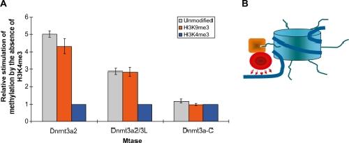 Figure 5. Methylation of DNA on modified oligonucleosomes. (A) Methylation of the first three CpG sites by full-length Dnmt3a2, full-length Dnmt3a2/Dnmt3L, but not Dnmt3a-C is stimulated by the absence of H3K4me3 (data taken from Figures 3 and 4). For each comparison, the methylation levels were normalized to H3K4me3, which showed the lowest methylation. Results shown are the average of three independent experiments; error bars indicate the standard deviations. (B) Schematic picture showing how the H3 tail interaction of Dnmt3a’s ADD domain (orange) anchors the catalytic domain (red) to methylate the linker DNA regions of nucleosomes.