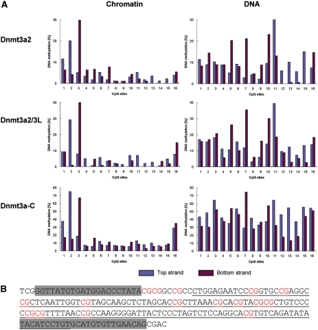 Figure 3. DNA methylation of unmodified chromatin and naked DNA by full-length Dnmt3a2, full-length Dnmt3a2/Dnmt3L complex and Dnmt3a-C. DNA methylation analysis was performed for both strands of DNA in chromatin substrates and DNA. Results shown are the average of three independent experiments. Altogether about 250 clones were sequenced for each strand and each data point. (A) Methylation levels of single CpG sites in the upper and lower strand of the DNA. (B) DNA sequence of the 601 monomeric unit (200 bp). The grey color shades the sequences of the forward and reverse primers. The red-color-labeled CpG sites were analyzed in this study. The nucleosome positioning sequence (147 bp) is underlined.