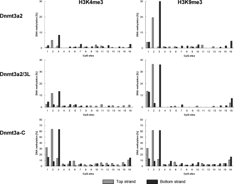 Figure 4. DNA methylation levels of single CpG sites in chromatin with H3K4me3 or H3K9me3 modifications by full-length Dnmt3a2, full-length Dnmt3a2/Dnmt3L and Dnmt3a-C. Results shown are the averages of three independent experiments. Altogether about 250 clones were sequenced for each strand and each data point.
