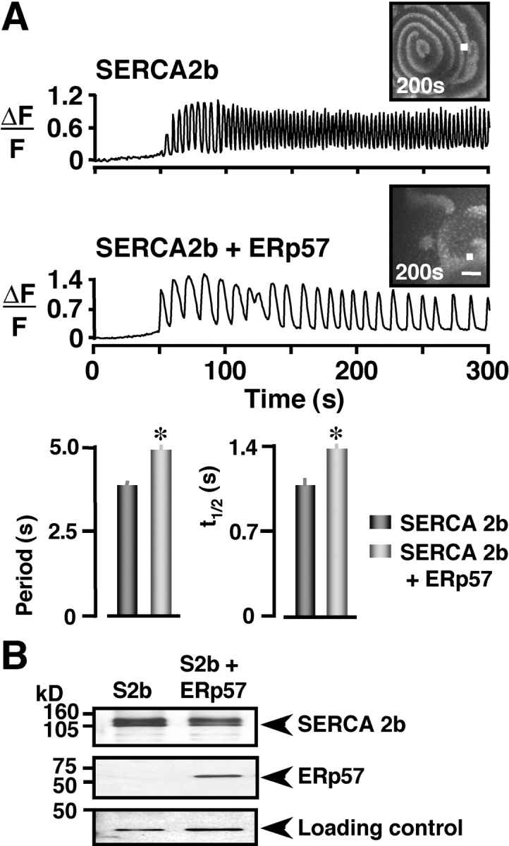 We demonstrated previously that calreticulin (CRT) interacts with the lumenal COOH-terminal sequence of sarco endoplasmic reticulum (ER) calcium ATPase (SERCA) 2b to inhibit Ca2+ oscillations. Work from other laboratories demonstrated that CRT also interacts with the ER oxidoreductase, ER protein 57 (also known as ER-60, GRP58; ERp57) during folding of nascent glycoproteins. In this paper, we demonstrate that ERp57 overexpression reduces the frequency of Ca2+ oscillations enhanced by SERCA 2b. In contrast, overexpression of SERCA 2b mutants defective in cysteines located in intralumenal loop 4 (L4) increase Ca2+ oscillation frequency. In vitro, we demonstrate a Ca2+-dependent and -specific interaction between ERp57 and L4. Interestingly, ERp57 does not affect the activity of SERCA 2a or SERCA 2b mutants lacking the CRT binding site. Overexpression of CRT domains that disrupt the interaction of CRT with ERp57 behave as dominant negatives in the Ca2+ oscillation assay. Our results suggest that ERp57 modulates the redox state of ER facing thiols in SERCA 2b in a Ca2+-dependent manner, providing dynamic control of ER Ca2+ homeostasis.