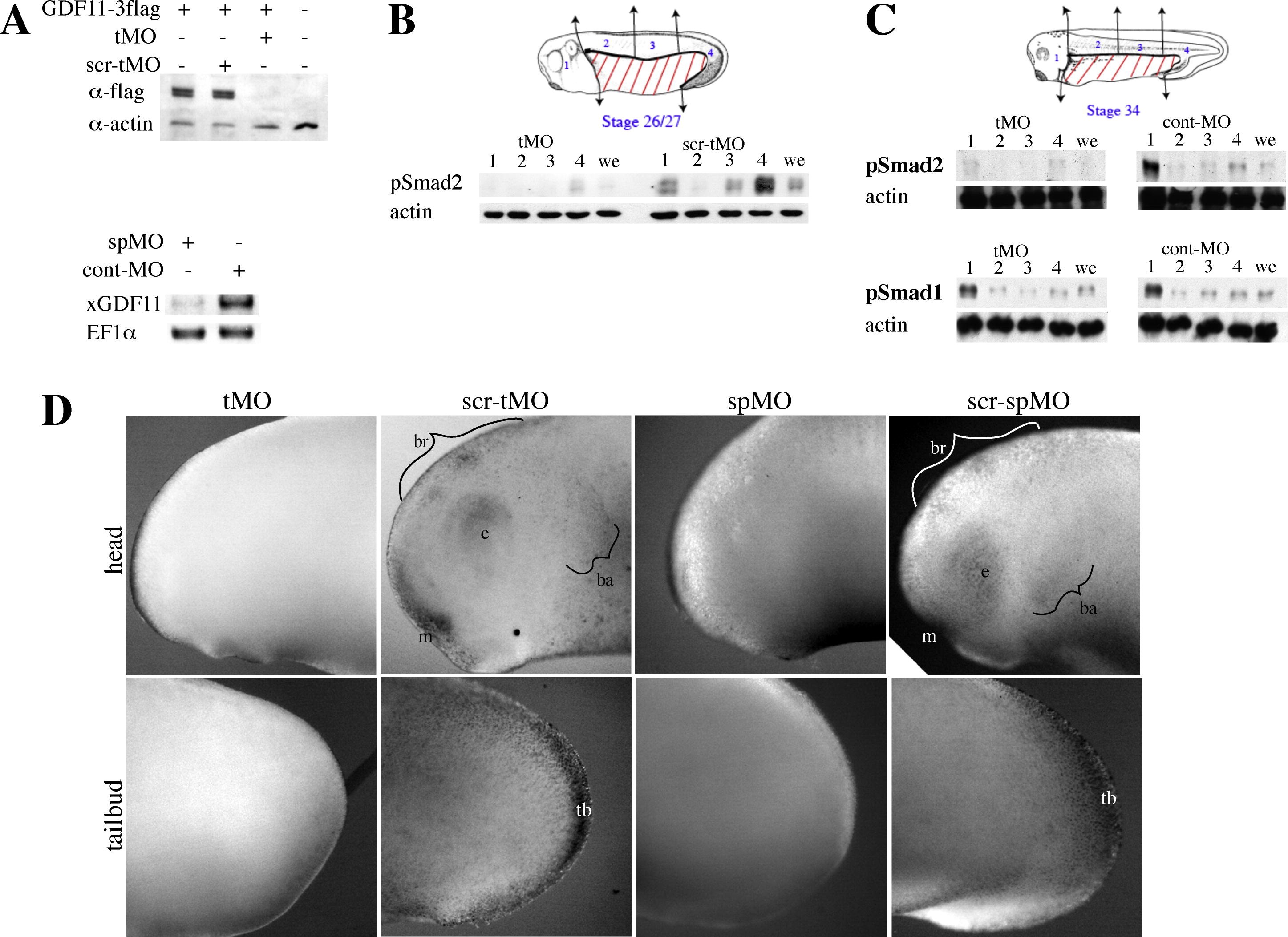 Fig. 4. GDF11 knockdown results in loss of p-Smad2 at tailbud stages. (A) Confirmation of xGDF11 morpholino oligos. Top panel: embryos were injected with 50 pg xGDF11-3flag mRNA along with 50 ng of tMO or scr-tMO and harvested at stage 10+ (uninjected controls were stage 11) for Western blotting against the flag epitope. Actin was used as a loading control. Bottom panel: embryos injected with 20 ng spMO or cont-MO were harvested at stage 25 for RT-PCR using primers spanning the splice site targeted by spMO. Elongation factor 1a (EF1a) was used as a loading control. (B) Effect of xGDF11 knockdown on p-Smad2 at stage 26/27. Embryos injected with 50 ng xGDF11 tMO or scr-tMO were dissected into regions 1 (head, anterior dorsal trunk, medial dorsal trunk, and posterior dorsal trunk/tailbud, respectively) as indicated in the schematic and Western blotted for p-Smad2. we, whole embryo. Actin was used throughout as a loading control. (C) Effect of xGDF11 knockdown on p-Smad2 and p-Smad1 at stage 34. Embryos injected with 40 ng xGDF11 tMO or cont-MO were dissected into regions 1 as indicated in the schematic and Western blotted for p-Smad2 (top) and p-Smad1 (bottom). (D) xGDF11 knockdown eliminates endogenous p-Smad2 staining in multiple tissues at stage 25. Embryos were injected with 60 ng xGDF11 tMO, 60 ng xGDF11 scr-tMO, 20 ng xGDF11 spMO, or 20 ng xGDF11 scr-spMO and immunostained at stage 25 with anti-p-Smad2. br, brain; e, eye; ba, branchial arches; m, mouth; tb, tailbud.