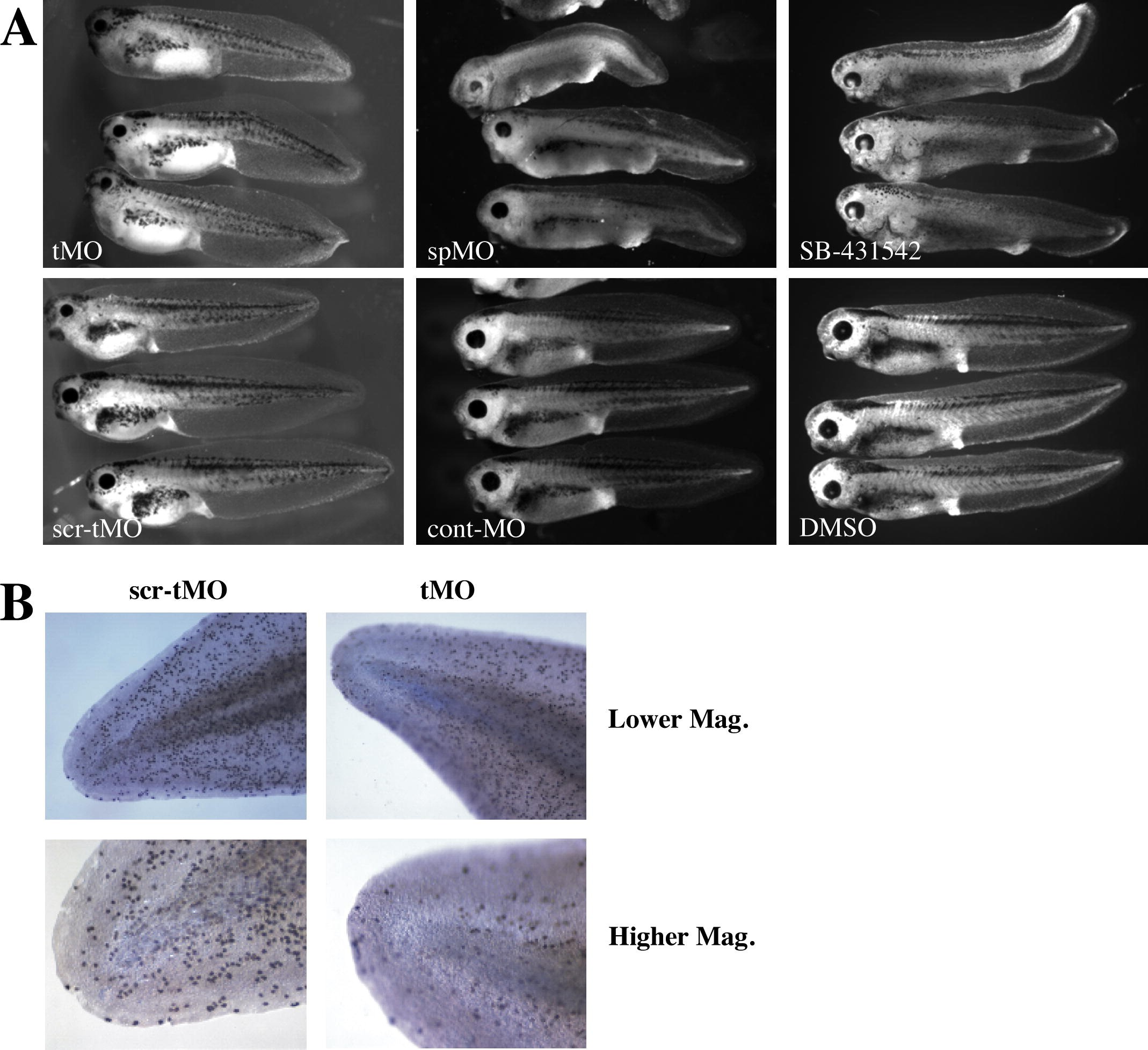 Fig. 5. Effect of xGDF11 knockdown on embryonic phenotype. (A) Phenotype of stage 41 embryos injected with 60 ng tMO versus scr-tMO (left), and of stage 40 embryos injected with 20 ng spMO or cont-MO (center), and stage 40 embryos treated with 100 mM SB-431542 or 0.1% DMSO at stage 13. (B) Cell proliferation was measured by phospho-histone H3 staining of tails from stage 40 embryos treated with 60 ng xGDF11 tMO (right) or 60 ng xGDF11 scr-tMO (left). Higher magnification of each tail tip is shown at bottom. Data shown are typical of three separate experiments, a similar reduction in proliferation with xGDF11 knockdown was seen when measured using BrdU incorporation (not shown).