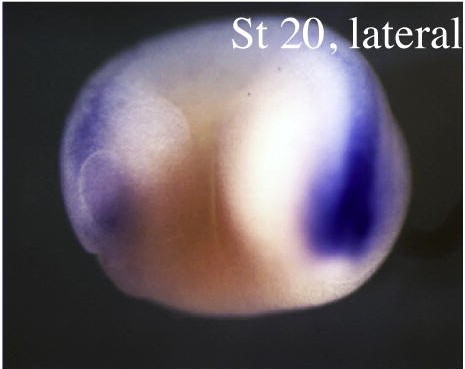 gdf11.1 ( growth differtiation factor 11, gene 1 ) gene expression in Xenopus laevis embryos, NF stage 20, as assayed by in situ hybridization, lateral view, anteriorleft, dorsal up.