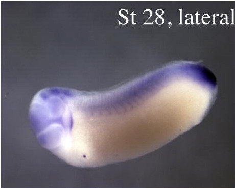 gdf11.1 ( growth differtiation factor 11, gene 1 ) gene expression in Xenopus laevis embryos, NF stage 28, as assayed by in situ hybridization, lateral view, anteriorleft, dorsal up.