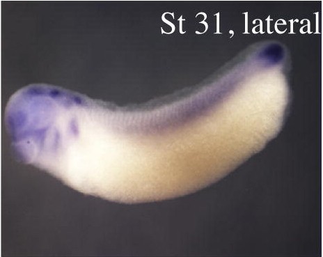 gdf11.1 ( growth differtiation factor 11, gene 1 ) gene expression in Xenopus laevis embryos, NF stage 31, as assayed by in situ hybridization, lateral view, anteriorleft, dorsal up.