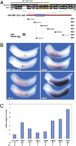 Fig. 3. Antisense morpholino oligonucleotide-mediated protection of the nanos1 homology element strongly inhibits somatic clearance of XDE-LE. (A) Partial alignment of XDE-LE-R with the zebrafish nanos1 3â²UTR reveals a homologous sequence element (XDE nucleotide positions indicated) covering the dre-miR-430b target site (orange box). Identical nucleotides of XDE-LE-R are highlighted in black. The XDE-LE-R is represented by a red rectangle; the position of the nos1 homology domain is marked by a blue box. (B and C) Vegetal coinjection of antisense MOs (1.5 pmol each) with GFP-XDE-LE-R reporter mRNA (1.1 ng) led to inhibition of somatic reporter RNA clearance to variable extent; the strongest effect was achieved by MO7 targeting the nos1 homology region (Table S1). (B) Lateral view of representative embryos stained with a GFP antisense probe. (C) Diagram representing average pixel quantification results of in situ hybridization signals from embryos analyzed on both sides. The statistical significance of the obtained series of values was verified by one-tailed Student's t-test (type 3, P < 0.01; P values: LE-R/MO1: 2.695E-50, LE-R/MO2: 1.299E-14, LE-R/MO3: 0.004, LE-R/MO4: 7.53E-06, LE-R/MO5: 1.133E-47, LE-R/MO6: 3.216E-45, LE-R/MO7: 3.949E-57). Values were adjusted to the score of GFP-XDE-LE alone, which was set to 1. |