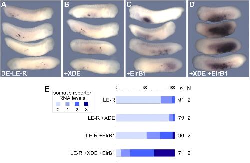 Fig. 6. ElrB1 and Xenopus Dead end proteins act synergistically in the somatic stabilization of XDE-LE reporter mRNA. (AâE) Whereas vegetal coinjection of FL-XDE mRNA (100 pg, B) or low levels of MT-ElrB1 mRNA (50 pg, C) with GFP-XDE-LE-R reporter mRNA (1.1 ng) led to no traceable or moderate somatic protection of XDE-LE-R, respectively, coexpression of both proteins (same amounts of injected mRNAs) strongly enhanced the stabilizing effect (D and E). (E) Comparison of somatic reporter RNA levels (%) scored in the injected embryos. |