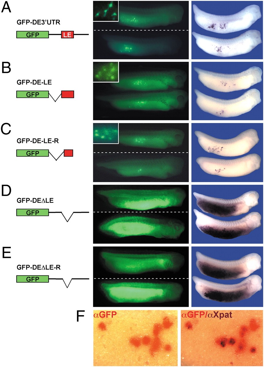 Fig. 1. The vegetal localization element of XDE mediates germ-line GFP expression by somatic mRNA clearance and PGC-specific RNA accumulation. (AâE) Two-cell-stage embryos were injected either vegetally with reporter mRNAs, cultivated to stage 30â34 and monitored for GFP protein expression (Left), or fixed and analyzed for GFP reporter RNA distribution (Right). PGC-specific GFP protein expression (magnified views in insets) was observed upon injection of 1.2â1.8 ng GFP-XDE 3â²UTR (A, 69%, n = 52, N = 2), 1.2 ng GFP-XDE-LE (B, 73%, n = 74, N = 2), and 1.1 ng GFP-XDE-LE-R (C, 71%, n = 28, N = 1). In contrast, ubiquitous GFP protein expression was exhibited by 100% of embryos injected with 1.5 ng GFP-XDEδLE (D, n = 28, N = 1) or 93% of embryos injected with 1.6 ng GFP-XDEδLE-R (E, n = 14, N = 1). GFP RNA was specifically detected in PGCs in 72% (A, n = 44, N = 1) for XDE 3â²UTR-injected embryos, in 78% (B, n = 82, N = 2) for XDE-LE-injected embryos and 82% (C, n = 74, N = 1) for XDE-LE-R-injected embryos. (D and E) High endodermal levels of GFP RNA were detected in embryos injected with XDEδLE (D, 97%, n = 113, N = 3) and XDEδLE-R (E, 100%, n = 69, N = 3). (F) Aspect of a single embryo injected with GFP-XDE-LE and double-stained for GFP (red) and the PGC marker Xpat (purple), photographed after the first (Left) and the second (Right) staining reaction. Although the time for the Xpat staining reaction was reduced, the majority of mGFP5-positive cells also exhibit Xpat signals. n, no. of injected embryos; N, no. of experiments. |