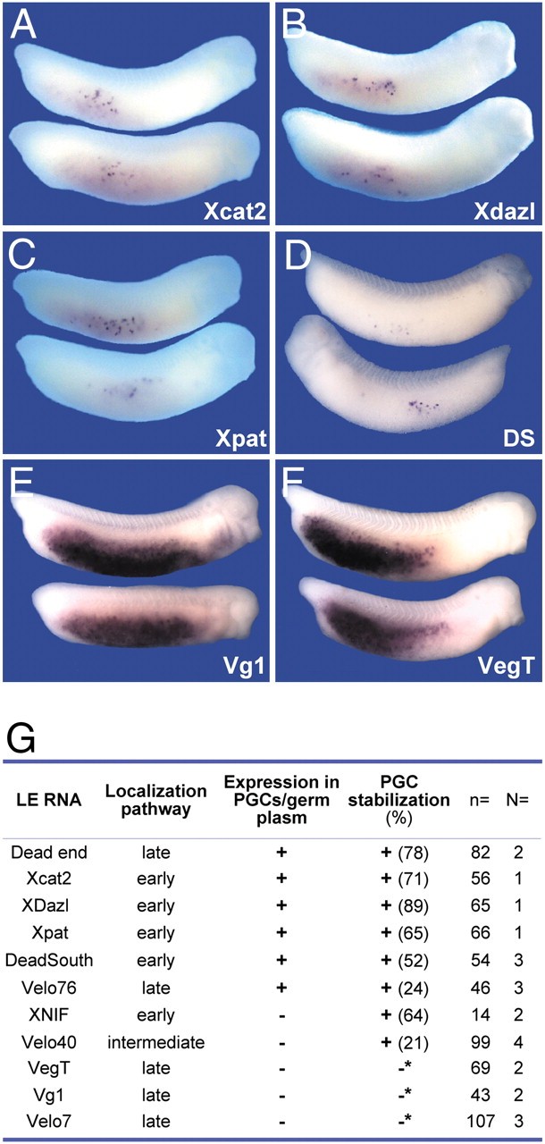 Fig. 2. Somatic RNA clearance is mediated by LEs of other vegetally localized mRNAs expressed in the germ line. (AâF) GFP-tagged LE reporter mRNAs of Xcat2 (A, 800 pg), XDazl (B, 800 pg), Xpat (C, 800 pg), VegT (1.2 ng), Vg1 (1.2 ng), Dead end (XDE-LE, 1.2 ng), or lacZ-tagged LE mRNAs (2 ng each) of the DeadSouth isoform (D) Velo76, XNIF, Velo 40, and Velo7 were injected vegetally into both blastomeres of two-cell-stage embryos. Embryos (stage 30â32) were analyzed for reporter RNA distribution by in situ hybridization using antisense GFP or lacZ probes. (G) LEs of the majority of vegetally localized mRNAs expressed in the germ line were found to mediate germ-line restriction of reporter RNAs irrespective of their transport pathway. Values for PGC stabilization indicate the percentage of embryos exhibiting PGC-specific reporter RNA staining (Fig. S5). Asterisk indicates that for Vg1 (E), VegT (F), and Velo7, PGC staining was detectable in <10% of injected embryos and accompanied by high somatic levels or reporter RNA (100%, 98.6%, and 46.7% of injected embryos, respectively). |