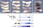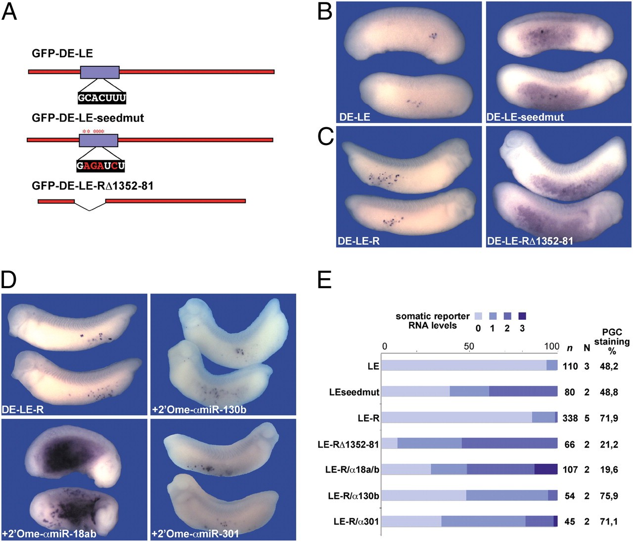 Fig. 4. Somatic clearance of XDE-LE-R reporter RNA is achieved by a microRNA-mediated mechanism. (A) Schematic overview of mutated or deleted reporter constructs. A blue rectangle marks the nos1 homology region; altered positions are marked by asterisks; mutations within the miR target motif are represented in red letters. (B) Mutation of the miR-430 target motif resulted in decreased somatic clearance of the XDE-LE reporter. Upon vegetal injection (2/2 cells) of 1.2 ng XDE-LE mRNA or XDE-LE-seedmut mRNA, somatic levels of reporter mRNAs were ranked visually into four classes: 0 (not detectable, as exemplified in D, Upper Left), 1 (weak; example in D, Lower Right), 2 (medium; example in C, Right), and 3 (very high; example in D, Lower Left). (C) Embryos injected with 1.1 ng XDE-LE-R mRNA or XDE-LE-Rδ-1352â81 mRNA were scored similarly. Partial deletion of the nos1 homology domain also resulted in decreased somatic clearance. (D) Vegetal coinjection of antisense 2â²OMeOs amiR-130b (α130b) or amiR-301 (α301) (6.4 pmol each) with 1.1 ng of XDE-LE-R reporter RNA resulted only in slight elevation of somatic reporter RNA levels, whereas coinjection of a mixture of the antisense 2â²OMeOs amiR-18a and amiR-18b (α18a/b) (3.2 pmol each) led to strong somatic stabilization of coinjected reporter RNA (Table S1). (E) Comparative diagram of somatic reporter RNA levels (%) scored in the injected embryos; in all cases, embryos compared were stained in parallel for the same time. |
