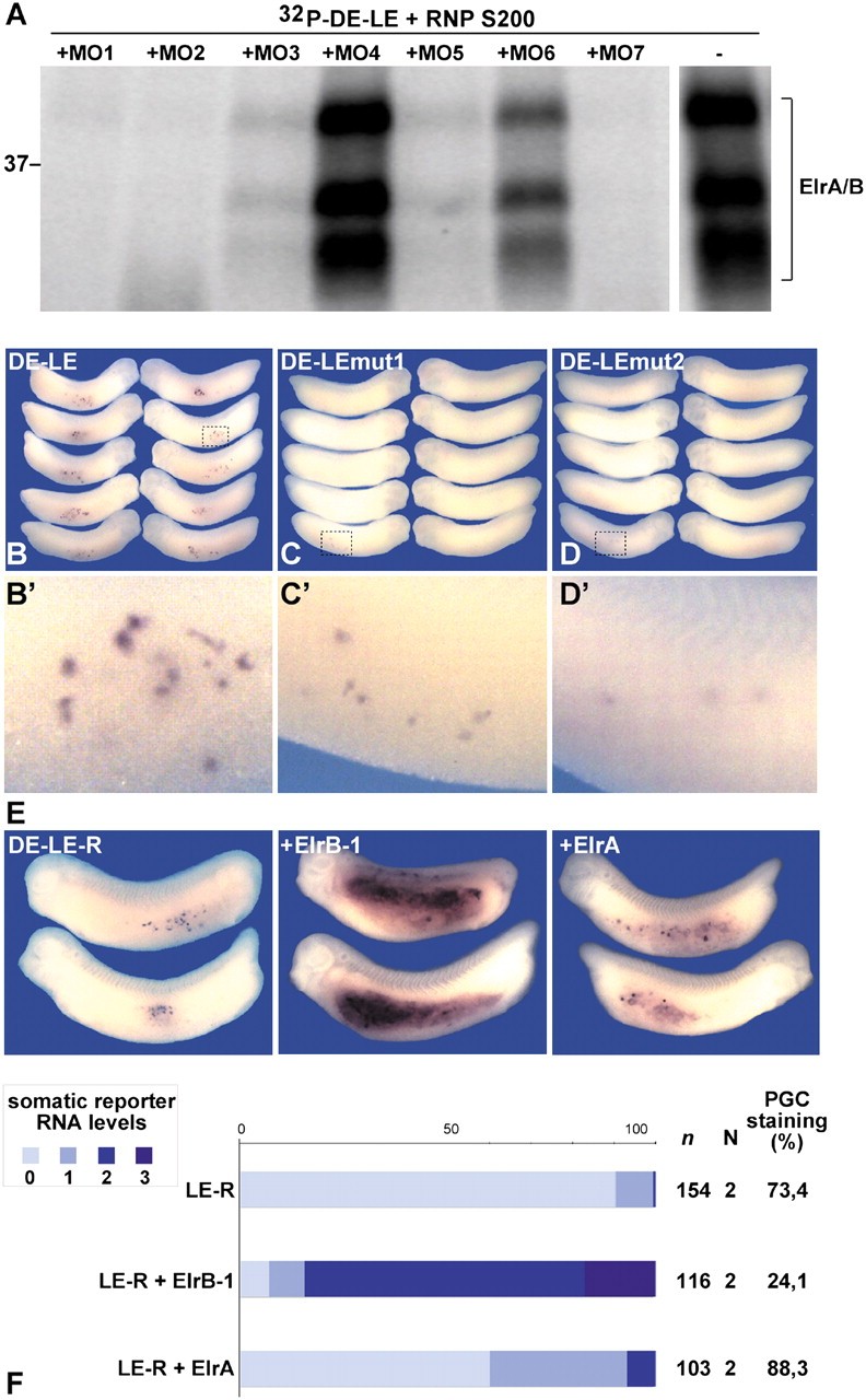 Fig. 5. Elr protein binding protects XDE-LE reporter RNA from somatic clearance. (A) UV cross-linking assay using radiolabeled XDE-LE-MO hybrids. 32P-labeled XDE-LE RNA was prehybridized with the antisense MOs indicated and incubated with fractionated oocyte extract before UV irradiation. Cross-linked proteins were separated by SDS/PAGE; the positions of molecular weight markers are indicated. (BâDâ²) Embryos were injected vegetally (2/2) with 800 pg of wild-type XDE-LE (B and Bâ², n = 78; N = 1) or mutant reporter mRNAs XDE-LE mut1 (C and Câ², n = 71; N = 1) and XDE mut2 (D and Dâ², n = 88; N = 1). (Bâ², Câ², and Dâ²) Magnified aspects of single embryos marked in B, C, and D. Injection of mutant XDE-LE reporter mRNAs deficient for Elr binding resulted in decreased intensities (Bâ², Câ², and Dâ²) and frequencies of PGC staining (11.3% for XDE-LE mut1, 12.5% for XDE mut2) compared with the wild-type XDE-LE (83.3% PGC staining). (E) Both blastomeres of two-cell-stage embryos were injected vegetally with 1.1 ng of XDE-LE-R reporter mRNA alone or together with 200 pg of MT-ElrB1 mRNA or 400 pg of MT-ElrA mRNA and scored for somatic reporter RNA levels as described (Fig. 4). Coexpression of ElrB1 led to strong somatic stabilization of XDE-LE-R, whereas only slightly elevated levels of somatic reporter levels were detected upon coinjection of ElrA. (F) Diagram of somatic reporter RNA levels (%) scored in ElrB1/ElrA-coninjected embryos. n, no. of injected embryos; N, no. of experiments. |
