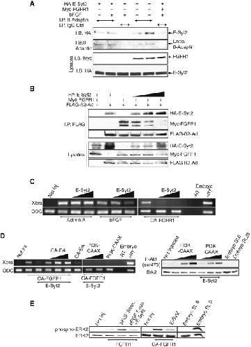 Figure 4. E-Syt2 Interacts with Adaptin-2 to Modulate Receptor Endocytosis, ERK Activation, and Xbra Induction(A) E-Syt2 interacts with the endogenous AP-2 tetramer. HA-E-Syt2 and Myc-tagged FGFR1 (Myc-FGFR1) were coexpressed in HEK293T cells stimulated or not with bFGF. Endogenous AP-2 complexes were immunoprecipitated with a β2-Adaptin-specific antibody or a nonspecific control antibody (IgG Ctrl) and I.B.(B) Both E-Syt2 and FGFR1 interact with the AP-2 complex. β2-adaptin (FLAG-β2-Ad) was coexpressed with FGFR1 (Myc-FGFR1) and with increasing amounts of E-Syt2 (HA-E-Syt2) and complexes were immunoprecipitated with an anti-FLAG antibody (I.P. FLAG). The upper panels show immunoblots for the coprecipitated proteins and the lower panels show protein levels in the input protein lysate.(C) E-Syt2 gain of function also inhibits bFGF and activated FGFR1 (CA-FGFR1)-mediated, but not Activin-mediated Xbra induction in ACs.(D) Left panel, constitutively activated-ERK (CA-ERK) but not constitutively activated PI3K (PI3K-CAAX) expression rescues E-Syt2 inhibition of Xbra induction by CA-FGFR1 in ACs. Right panel, consistent with this PI3K-CAAX activation of Akt in ACs is not strongly affected by E-Syt2 gain of function.(E) E-Syt2 gain of function inhibits ERK activation by CA-FGFR1 (anti-phospho-Erk immunoblot) in ACs.See also Figure S4.