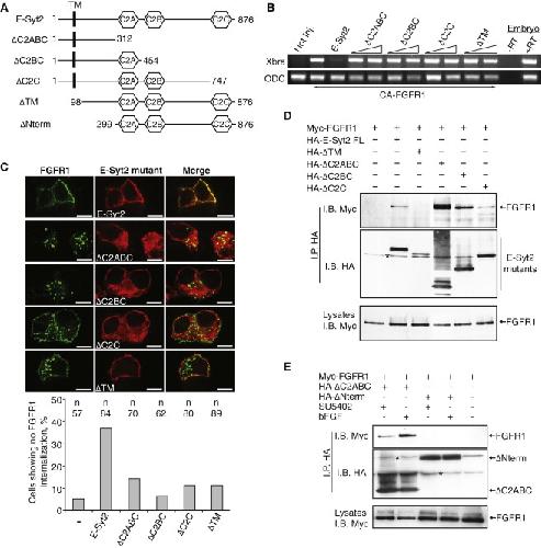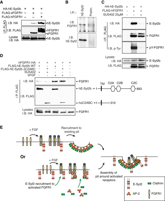 Figure 7. The Interaction between FGFR1 and E-Syt2 Is Conserved in Human(A) Human E-Syt2b (HA-hE-Syt2b) was coexpressed with Xenopus or human FGFR1 (FLAG-xFGFR1 or -hFGFR1) in HEK293T cells, the receptors immunoprecipitated and proteins analyzed by immunoblotting.(B) Endogenous human E-Syt2 was immunoprecipitated from a whole-cell extract using xE-Syt2 antibody #2 and the precipitate immunoblotted for both hE-Syt2 (hE-Syt2#Pr0863-2932r, see Experimental Procedures) and hFGFR1 (Flg #121, Santa Cruz Biotechnology).(C) Human E-Syt2b interacts specifically with activated FGFR1. hE-Syt2b (HA-hE-Syt2b) was coexpressed with human FGFR1 (FLAG-hFGFR1) in HEK293T cells and receptor activation inhibited with SU5402. The receptor was then immunoprecipitated and proteins analyzed by immunoblotting.(D) Specific interaction between hE-Syt2b and activated hFGFR1 requires the N-terminal domain of hE-Syt2b. Full-length hE-Syt2b or the mutant FLAG-hδC2ABC containing aa 1â312 was coexpressed with hFGFR1 in HEK cells as in (C). Cells were then treated with either bFGF or with the inhibitor SU5402 before immunoprecipitation and analysis of FLAG-positive complexes.(E) Potential E-Syt2 functions in FGF signaling. Two possible modes of action are suggested; see text for more detail.See also Figure S7.