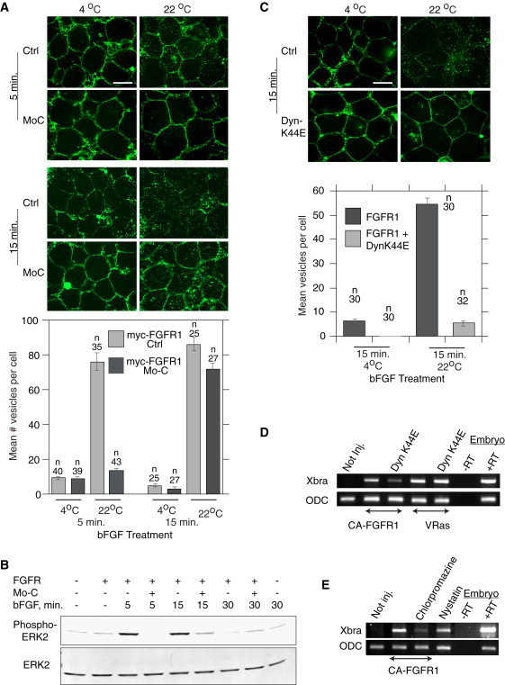 Figure 3. E-Syt2 Is Required In Vivo for FGF Receptor Endocytosis and Signaling via the Clathrin Pathway(A) E-Syt2 depletion inhibits FGF receptor endocytosis in vivo. Each blastomere of four cell embryos was injected with 6 pmol of Morpholino C (Mo-C) and 20 pg of Xenopus Myc-FGFR1 mRNA. ACs were then isolated and incubated with anti-Myc antibody to label surface receptors. After incubation with bFGF at 4°C or 22°C for the indicated times, ACs were subjected to indirect immunofluorescence labeling to reveal receptor endocytosis. The upper panels show typical images and the lower panel the statistical analysis of receptor internalization.(B) Embryos were injected and ACs were isolated and treated with bFGF at 22°C as in (A), before analysis of cell extracts for ERK and phospho-ERK levels by immunoblotting.(C) Dominant-negative Dynamin also inhibits FGFR1 endocytosis in vivo. ACs expressing Myc-FGFR1 alone or with Dynamin K44E (Dyn-K44E) were prepared and treated with bFGF and were analyzed for receptor endocytosis as in (A). In (A) and (C), ânâ indicates the number of cells scored, scale bar in micrographs represents 30 μm, and error bars indicate the standard error.(D) Induction of Xbra in ACs requires FGFR1 endocytosis upstream of VRas. Embryos were injected with either CA-FGFR1 or VRas and DynK44E mRNAs and Xbra and ODC mRNA levels determined by RT-PCR.(E) ACs expressing CA-FGFR1 were also treated with clathrin or caveolin inhibitors, chlorpromazine and nystatin before RT-PCR analysis as in (D).In (D) and (E), +RT and âRT refer to control PCR analysis of whole embryo RNAs with and without reverse transcriptase.See also Figure S3.
