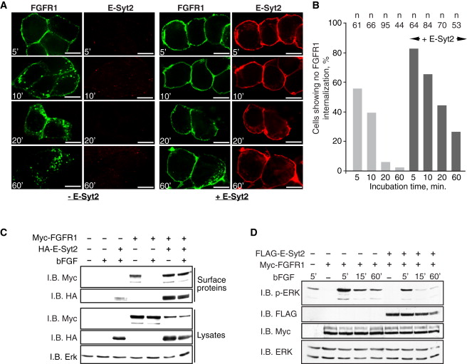 Figure 5. Gain of E-Syt2 Function Inhibits FGFR1 Endocytosis(A) HEK293T cells were transfected with Myc-FGFR1, with or without HA-E-Syt2, treated with bFGF and internalization of plasma membrane receptor followed. Panels show typical image fields of the localization of the initially plasma membrane fraction of FGFR1 and of total E-Syt2 at various times after bFGF addition. Scale bar, 10 μm.(B) Statistical analysis of receptor uptake during analyses as in (A). ânâ indicates the total number of cells analyzed in repeat experiments.(C) Myc-FGFR1 and HA-E-Syt2 were expressed as in (A), but surface proteins were biotin labeled before adding bFGF. Biotin-labeled surface proteins were then isolated and analyzed by immunoblotting (I.B.).(D) Time course of Erk activation following bFGF treatment in the presence or absence of E-Syt2 gain of function. The experiment was performed as in (A), but total protein lysates were recovered at the indicated time following bFGF addition and were analyzed by immunoblotting.See also Figure S5.