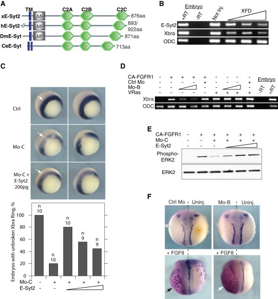 Figure 1. Xenopus E-Syt2 Is Required for Induction of the Early Mesoderm Gene Xbra and for FGF Signaling(A) Predicted structural domains of E-Syt2 orthologs, âxâ Xenopus, âhâ human, âDmâ Drosophila melanogaster, âCeâ Caenorhabditis elegans.(B) Zygotic E-Syt2 expression depends on FGF signaling. FGF signaling was inhibited by the expression of the dominant-negative FGF receptor âXFDâ (100, 200, and 400 pg) in ventral marginal zone (VMZ) explants.(C) In vivo Xbra expression is suppressed by E-Syt2 depletion. Dorsal blastomeres of four cell embryos were each injected equatorially with 0.75 pmol of Mo-C and increasing amounts of HA-E-Syt2 mRNA and Xbra expression at stage 10.5 revealed by whole-mount in situ hybridization.(D) E-Syt2 depletion suppresses ectopic induction of Xbra by activated FGFR1. Embryos were injected with 0.9 or 1.8 pmol Mo-B or Ctrl Mo and with 2.5 pg constitutively active FGFR1 (CA-FGFR1) or 5 pg VRas.(E) Activated FGFR1 (1.5 pg/cell, four cell embryos) induction of ectopic ERK activation in ACs was also suppressed by depletion of E-Syt2 (3 pmol MoC/cell).(F) Depletion of E-Syt2 also suppresses FGF8-dependent differentiation. Embryos were unilaterally coinjected with FGF8 (2.5 pg), β-galactosidase (325 pg) mRNAs, and E-Syt2 Mo-B or Ctrl Mo (2 pmol) and subjected to whole-mount in situ to reveal N-tubulin expression (blue). Purple staining (β-galactosidase activity assay) indicates injected side of embryo.See also Figure S1.