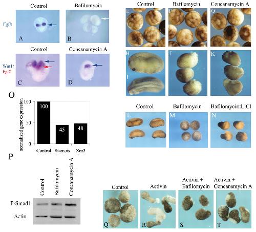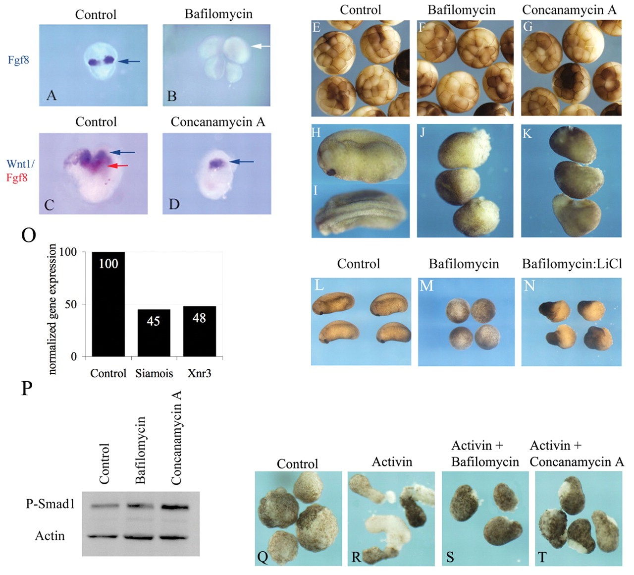 Fig. 2. Inhibition of vesicular acidification mimics loss of function of canonical and non-canonical mediated Wnt effects in vivo. (AâD) Bafilomycin and concanamycin A treatment results in a loss of Fgf8 transcripts in chick mbâr2 explants. These explants were isolated from HH10 chick embryos, embedded in collagen and treated with drug for 24 hours. Explants were probed for the expression of Fgf8 mRNA (A and B, blue; C and D, red) and Wnt1 mRNA (C and D, blue). Explants A and B were processed simultaneously, as were explants C and D. The differences in explant size are consistent with drug-induced inhibition of Wnt secretion and Wnt-dependent loss of fibroblast growth factor (FGF), as these are well-established mitogens in neural development (Canning et al., 2007). (EâK) Bafilomycin and concanamycin lead to a loss of axial patterning in Xenopus laevis embryos. Two-cell embryos were cultured for 24 hours alone (E) or in 1 µM bafilomycin (F,J) or 2 µM concanamycin (G,K). Drug treatment had no effects on embryos assessed at the 32-cell stage (EâG), demonstrating they are healthy and viable during the early stages of development. Drug-induced Wnt-dependent defects are seen as the embryos undergo gastrulation, as seen at the 24-hour time point (HâK). Control embryos (H,I) develop normally, whereas those cultured in the presence of bafilomycin or concanamycin A have disrupted axial development. (LâN) Treatment of whole embryos with 20 mM LiCl rescues the effect of treatment (as above) with 1 µM bafilomycin. (O) The Wnt targets Siamois and Xnr3 are induced by Xenopus Wnt8 but are reduced to 45% and 48%, respectively, in the presence of 1 µM bafilomycin. Animal caps were injected with control (not shown) or Xenopus Wnt8. Gene expression is measured relative to that of ODC, an internal control. (P) Treatment of whole embryos with vesicular acidification inhibitors does not abrogate all signaling events in the early embryo, as assayed by phosphorylation of Smad-1, a read-out of activation of BMP signaling. Actin serves as a loading control. (QâT) Bafilomycin and concanamycin A treatment inhibits non-canonical-mediated convergent extension movements in Xenopus embryos. (Q) Animal caps dissected from control embryos do not undergo convergent extension movements compared with those treated with activin alone (R). Bafilomycin (S) and concanamycin A (T) treatment inhibits activin-mediated convergence and extension.