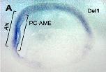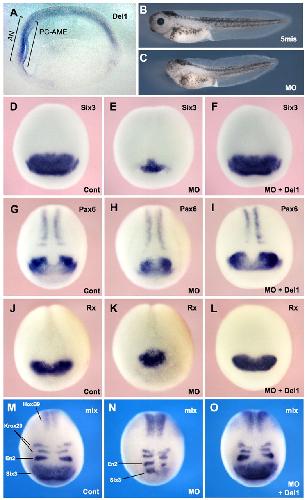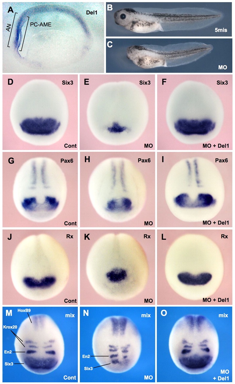 Fig. 3. Del1 is essential for the formation of anteriorbrain tissues. (A) Expression pattern of Del1 at the early neurula stage (sagittal section; anterior side is left). AN, anteriorneuroectoderm; PC-AME, prechordal anteriormesendoderm. (B,C) Effects of animal cell injection of 5mis-MO (12.5 ng) or Del1-MO (12.5 ng) at the 8-cell stage. (D-O) Effects on expression of neural markers of animal cell injection of Del1-MO (25 ng) at the 8-cell stage (E,H,K,N). These effects were rescued by co-injecting MO-insensitive Del1 mRNA (100 pg) (F,I,L,O). Compare with controls (D,G,J,M). mix, mixed probes (Six3, En2, Krox20 and HoxB9).