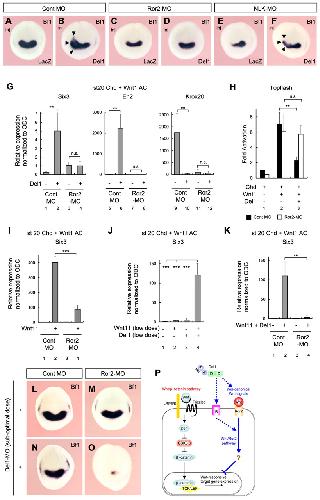 Fig. 6. The Ror2 pathway is essential for Del1 function. (A-F) Combinations of Del1 (400 pg), lacZ (400 pg), control-MO (4 ng), Ror2-MO (4 ng) and NLK-MO (4 ng) as shown were injected into the two unilateral animal blastomeres at the 8-cell stage and harvested at the neurula stage. Arrowheads indicate expansion of Bf1. Ror2-MO injection at a dose higher than 4 ng frequently caused spina bifida or exogastrulation in vivo, presumably because of convergent-extension defects. (G) Animal caps were injected with combinations of Chd (100 pg), Wnt1 (5 pg), Del1 (500 pg), control-MO (8 ng) and Ror2-MO (8 ng) as shown, cultured until the siblings reached stage 20, and analyzed by qPCR. (H) Animal caps were injected with Chd (100 pg), Wnt1 (10 pg), Del1 (500 pg), control-MO (8 ng) or Ror2-MO (8 ng) and analyzed for luciferase activity. (I) Animal caps were injected with combinations of Chd (100 pg), Wnt1 (5 pg), Wnt11 (200 pg), control-MO (8 ng) and Ror2-MO (8 ng) as shown, cultured until the siblings reached stage 20, and analyzed by qPCR. (J,K) Animal caps were injected with combinations of Chd (100 pg), Wnt1 (5 pg), Wnt11 (10 pg), Del1 (200 pg), control-MO (8 ng) and Ror2-MO (8 ng) as shown, cultured until the siblings reached stage 20, and analyzed by qPCR. **, P<0.01; ***, P<0.001. n.s., not significant. Error bars represent s.d. (L-O) Animal cell injection of Del1-MO (10 ng) and Ror2-MO (4 ng) coordinately suppressed the expression of Bf1 at the neurula stage. The frequency of strong Bf1 suppression was: 0%, n=29 (L); 0%, n=47 (M); 9%, n=43 (N); 80%, n=35 (O). (P) Working hypothesis for Del1 function in the modulation of the canonical Wnt pathway (see text for details). E, EGF-like domain; D, Discoidin domain; R, presumptive Del1 receptor; LRP5/6, LDL receptor-related protein 5/6. Question marks indicate presumptive intracellular modulator(s) of the Wnt/Ror pathway.