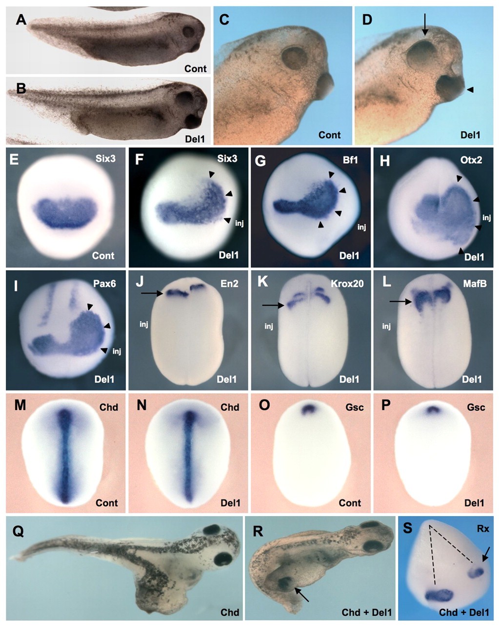 Fig. 1. Del1 expands anterior ectodermal structures of the Xenopus embryo. (A-D) Uninjected tadpole stage embryo (A,C). Tadpoles after animal-side injection of Del1 mRNA (200 pg) at the 8-cell stage (B,D). Arrow, eye; arrowhead, cement gland. (E-P) Whole-mount in situ hybridization analysis of early neurula (E-I,M-P) or mid neurula (J-L) embryos. Del1 mRNA (200 pg) was injected into two animal blastomeres on one side of the 8-cell embryo. Arrowheads and arrows indicate expansion and posterior shifts of each marker, respectively. (N,P) Del1 mRNA (200 pg) was injected into all animal blastomeres of the 8-cell embryo. (Q-S) Co-injection of Del1 and Chd mRNAs induced head structures (arrow) in the secondary axis (R). Chd (50 pg) and Del1 (400 pg) mRNAs were injected into one ventro-vegetal blastomere of the 8-cell embryo. Dashed lines indicate the axes of the neurulaembryo (S). The ectopic expression of Rx in the secondary axis is indicated by an arrow (S).