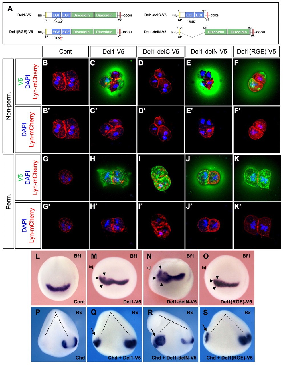 Fig. 2. The pericellular matrix protein Del1 functions as an anteriorizing factor via its Discoidin domains. (A) Structure of Del1-V5 and its mutant derivatives. (B-Kâ²) Xenopus embryos were co-injected with Lyn-mCherry (20 pg), Del1-V5 (400 pg), Del1-V5(RGE) (400 pg), Del1-delC-V5 (400 pg) and Del1-delN-V5 (400 pg) mRNAs. Cultured cells were fixed with (G-Kâ²) or without (B-Fâ²) permeabilization, and immunostained with an anti-V5 antibody (green). Red, Lyn-mCherry; blue, DAPI. (L-O) The expansion of the Bf1-positive area (arrowheads) was induced by Del1-V5 (M; 400 pg; Bf1 expansion in 84%, n=44), Del1-delN-V5 (N; 200 pg) or Del1(RGE)-V5 (O; 400 pg) mRNAs. Embryos received injections into two animal blastomeres on one side of the 8-cell embryo. (P-S) The ectopic expression of Rx in the secondary axis (arrows) was induced by injecting Chd alone (P; 50 pg) or with Del1-V5 (Q; 400 pg; 53%, n=45), Del1-delN-V5 (R; 400 pg) or Del1(RGE)-V5 (S; 400 pg) mRNAs. Embryos received injections into one ventro-vegetal blastomere of the 8-cell embryo. Dashed lines indicate the axes of the neurulaembryo.