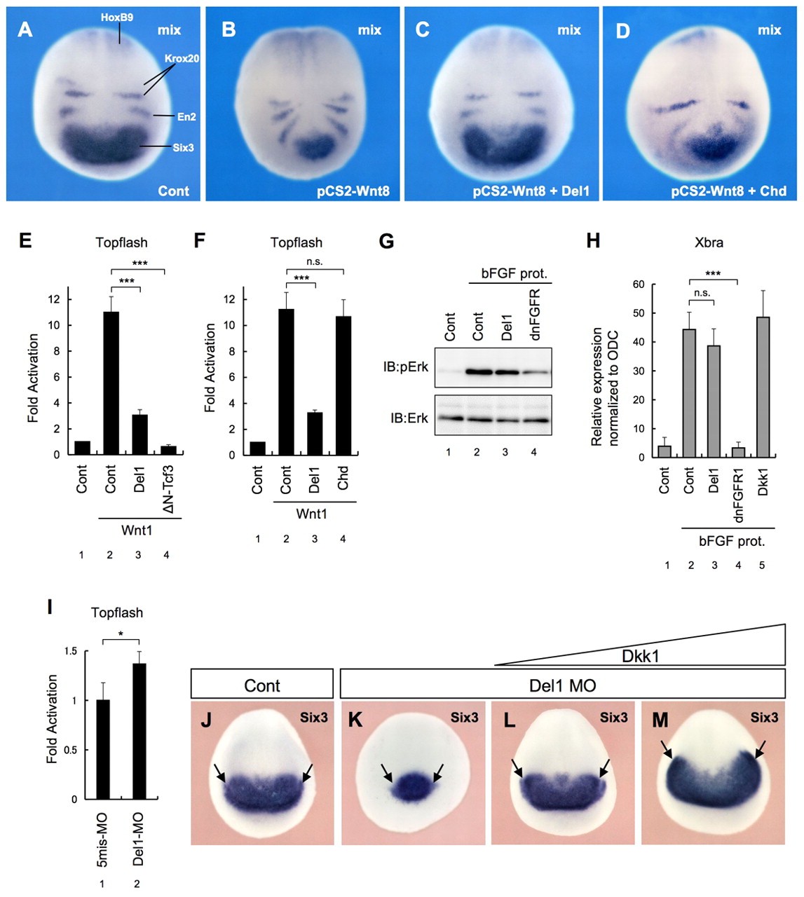 Fig. 4. Del1 antagonizes Wnt signaling in vitro and in vivo. (A-D) Co-injection of Del1 (400 pg, C) rescued posteriorization caused by injecting pCS2-Wnt8 (10 pg, B), whereas co-injection of Chd did not (100 pg, D); compare with the control (A). Xenopus embryos received injections into all the animal blastomeres at the 8-cell stage mix, mixed probes (Six3, En2, Krox20 and HoxB9). (E,F) Animal caps were injected with Wnt1 (10 pg), Del1 (500 pg), δN-Tcf3 (10 pg), or Chd (100 pg) mRNAs, then analyzed for luciferase activity. (G,H) Animal caps were injected with Del1 (500 pg), dominant-negative FGF receptor (dnFGFR; 100 pg), or Dkk1 (100 pg) mRNAs. (G) Explants were cultured with 50 ng/ml bFGF protein for 30 minutes and analyzed by immunoblotting. (H) Explants were cultured with 500 ng/ml bFGF protein for 3 hours and Xbra expression was analyzed by qPCR. (I) Del1-MO (25 ng) or 5mis-MO (25 ng) and reporter plasmids were animally injected into 8-cell stage embryos, and the anterior quarter of embryos was excised at stage 13 and subjected to the dual luciferase assay. *, P<0.05; ***, P<0.001. n.s., not significant. Error bars represent s.d. (J-M) Suppression of Six3 expression by injecting 25 ng of Del1-MO (K; suppression in 60%, n=30) was reversed by co-injecting 5 pg (L; equivalent to normal in 96%, n=27) or 25 pg (M; equivalent to normal or expansion in 100%, n=24) Dkk1 mRNA. Embryos received injections into all the animal blastomeres at the 8-cell stage and were harvested at the mid-neurula stage. Arrows indicate expression borders of Six3.