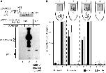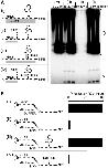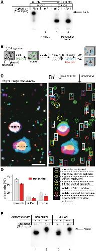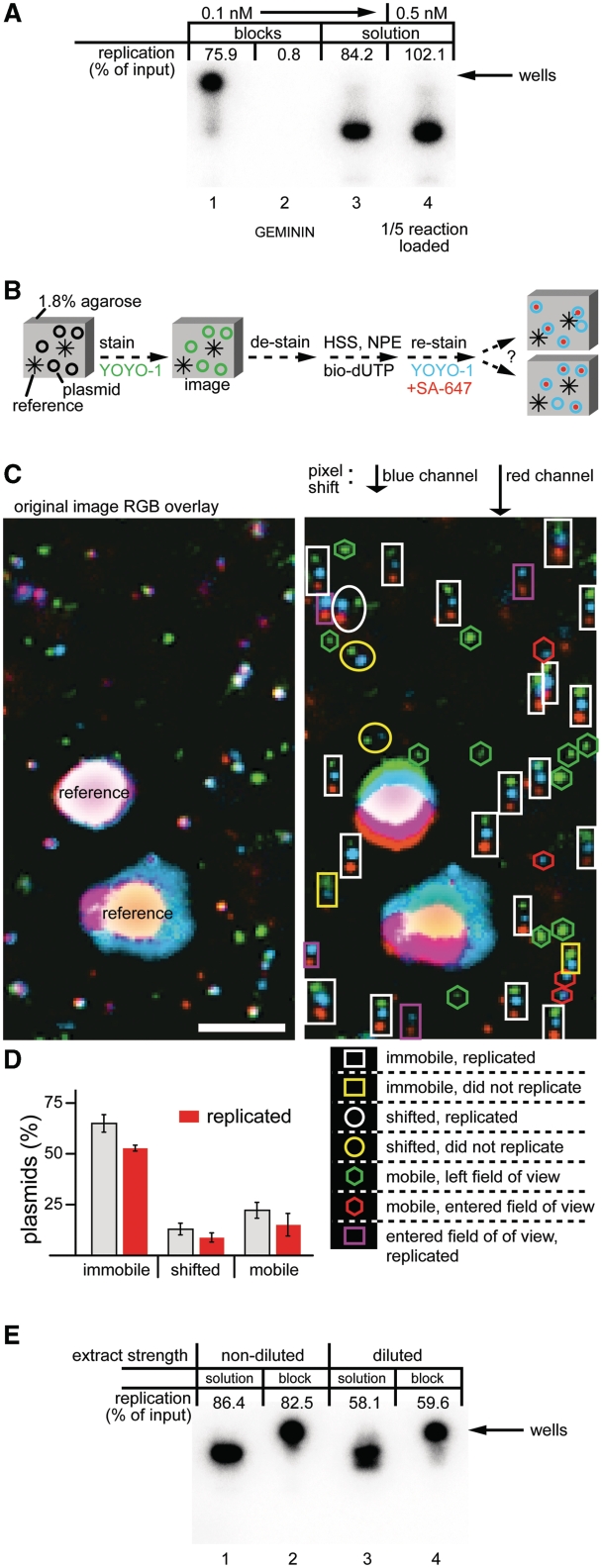 Figure 2. Efficient DNA replication of immobilized plasmids. (A) The 1.8% agarose blocks (5 µl) containing 0.1 nM p10.4 were incubated with two volumes of HSS, with or without Geminin. After 30 min, the supernatant was exchanged with two volumes of NPE containing [α-32P]dATP. Reactions in solution containing a final concentration of 0.1 or 0.5 nM p10.4 were carried out in parallel. In all cases, DNA replication efficiency was determined 90 min after NPE addition. In lanes 1 and 2, the DNA was not released from the block and thus remained in the well, where the block was loaded. In lane 4, one-fifth of the 0.5 nM reaction was loaded. (B) Cartoon illustrating procedure to determine plasmid position and replication in an agarose block. (C) The 1.8% agarose blocks containing 0.1 nM p10.4 and 2.8 µm beads (to provide reference points) were prepared. Plasmids were stained with YOYO-1, photographed and de-stained. Subsequently, HSS was added, followed by NPE containing biotin-dUTP. After 90 min, the blocks were stained again with YOYO-1 and the biotin-dUTP was detected with AlexaFluor 647 conjugated streptavidin (SA-647). The same position in the block that was imaged before extract addition was located and images were acquired by fluorescence microscopy. The green and blue channels represent the initial and final plasmid positions as determined by YOYO-1 staining, respectively. The red channel represents SA-647 staining of incorporated biotin-dUTP. The blue and red channels were shifted in the y-axis to facilitate analysis. Plasmid classification is shown below the shifted image. (bar = 5 µm) (D) The average percentage of plasmids that was immobile, shifted, or mobile from eight areas of a single block was calculated and graphed. The subset of plasmids in each group that replicated is shown in red. Error bars indicate the standard deviation of the eight areas that were scanned. (E) Replication in diluted extracts. p10.4 (0.1 nM) was replicated in agarose blocks or in solution as described in (A). In the ‘diluted’ condition, HSS and NPE were each diluted 5- and 4-fold with ELB, respectively. |