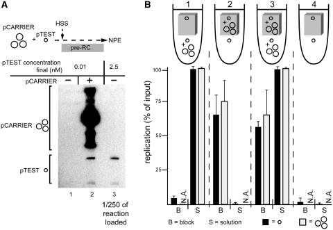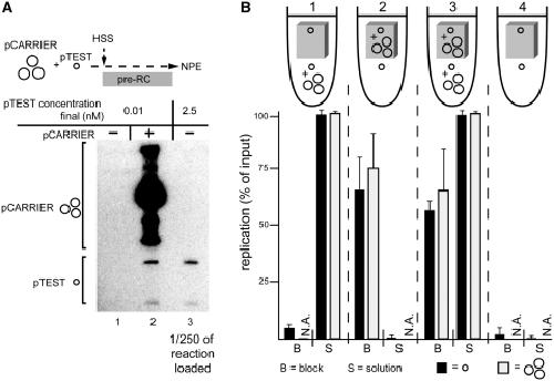 Figure 3. One plasmid activates replication of another in trans. (A) The effect of pCARRIER on pTEST plasmid replication in solution. In lane 2, pTEST (p2.9, single small circle) and pCARRIER (p10.4, group of large circles) were premixed and incubated in HSS at 0.03 and 1.5 nM final concentrations, respectively. In lanes 1 and 3, only pTEST was incubated in HSS (0.03 and 7.5 nM, respectively). Ninety minutes after addition of two volumes NPE, DNA replication was analyzed by gel electrophoresis and autoradiography. In lane 3, 1/250th of the total reaction was loaded. (B) Effect of pCARRIER on replication of pTEST plasmid in agarose blocks. The 1.8% agarose blocks (5 µl volume) were prepared containing pTEST (p2.9, 0.01 nM) with or without pCARRIER (p10.4, 0.5 nM). HSS was incubated with pCARRIER (p10.4, 1.5 nM final concentration) and pTEST (p2.9, 0.03 nM) or pTEST alone (p2.9, 0.03 nM) for 7.5 min. Ten microlitre of the extract/DNA mixture was then added to the agarose blocks. Relative to the entire HSS/block volume, two volumes of NPE containing [α-32P]dATP were added. At 90 min, the blocks were digested with agarase, and the released replication products were separated on an agarose gel alongside the DNA from the supernatants. Results from three independent experiments were quantified and the averages and standard deviations are graphed below a cartoon of each condition. |