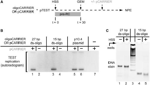 Figure 6. Short double-stranded oligonucleotides stimulate licensing. (A) Scheme to determine rescue of pTEST licensing. pCARRIER or oligoCARRIER was premixed with pTEST and incubated in HSS. After 30 min, Geminin was added, and after a further 10 min the reaction was supplemented with pCARRIER or buffer (p10.4, 1 nM, grey lettering to indicate post-GEMININ addition), followed by NPE. (B) Effect of oligoCARRIER on pTEST licensing. HSS containing pTEST (p2.9, 0.01 nM) was supplemented with a 27-bp duplex oligo (lanes 1 and 2, 20 ng/µl, 1.1 µM), 15-bp duplex oligo (lanes 3 and 4, 20 ng/µl, 2.0 µM), or pCARRIER (p10.4) (lanes 5 and 6, 20 ng/µl, 2.9 nM). Thereafter, the experiment proceeded as described in (A). Ninety minutes after NPE, the replication products were separated by gel electrophoresis and quantified by autoradiography. (C) Just prior to Geminin addition, the DNA/HSS mix from the 27- and 15-bp duplex oligo samples described in Figure 6B were treated with RNAse, phenol–chloroform extracted, separated by native PAGE, and imaged with Sybr-Gold staining (right gel, lanes 2 and 5), alongside input DNA minus HSS (lanes 1 and 4) and a 10-bp ladder (lane 3). |