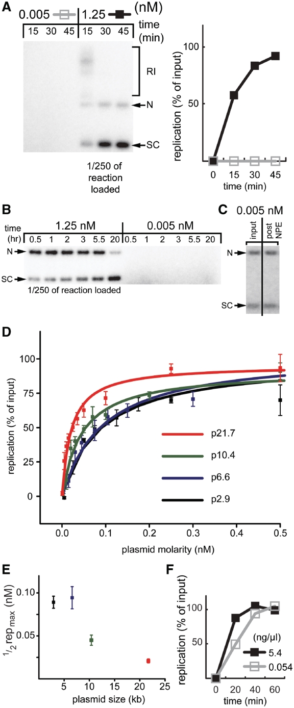 Figure 1. DNA replication is sensitive to plasmid concentration. (A) p2.9 was incubated in HSS at 0.015âor 3.75ânM final concentration. After 30âmin, two volumes of NPE containing [α-32P]dATP were added, reducing the final DNA concentrations to 0.005 and 1.25ânM, respectively. At various times after NPE addition, replication products were separated on a native agarose gel and analyzed by autoradiography. To examine equivalent quantities of DNA from both reactions, only 1/250th of the 1.25ânM reaction was loaded. The signal above background from the entire lane was used to calculate the percentage of replication and the results are graphed on the right. See Walter and Newport (2000) (28) for an explanation of the different replication products. RI, replication intermediates; N, nicked products; SC, supercoiled products. (B) p2.9 was replicated as in (A), except that samples were analyzed for DNA replication at later time points. (C) Low concentration plasmids do not undergo degradation in HSS/NPE. Radiolabeled p2.9 (for radiolabeling, see experimental procedures) was incubated in HSS/NPE as described in (A). The 45-min time point was separated on a gel (right lane) alongside the input (left lane). (D) The effect of plasmid concentration on DNA replication efficiency for four different plasmids. Plasmids were replicated as described in (A). Replication was analyzed 90âmin after NPE addition. Data from triplicate experiments were fit with yâ=âreplicationmax·[plasmid]/(Kâ+â[plasmid]) where K is ½ replicationmax. (E) The plasmid concentration that yields half maximal replication was derived from the curves in (D) and graphed. (F) Sperm chromatin was replicated as in (A) at a final concentration of 0.054 or 5.4âng/µl and the replication efficiency in each condition was graphed. |