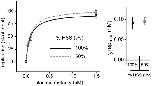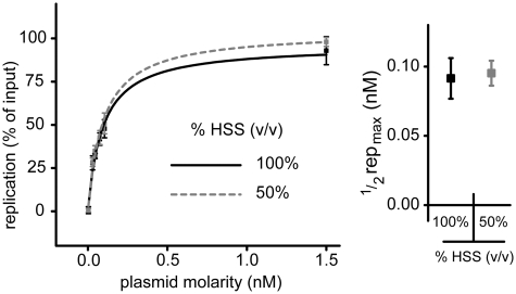 Figure 5. HSS dilution does not rescue replication at low DNA concentration. p6.6 was incubated for 30 min in 100% HSS or HSS diluted 50% v/v with buffer, followed by NPE addition. Replication was analyzed 90 min after NPE addition. Data from triplicate experiments were fit with y = replicationmax · [plasmid] / (K + [plasmid]) where K is ½ replicationmax. The p6.6 concentration that produces half-maximal replication was derived from the curves and graphed on the right. |
