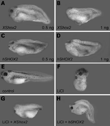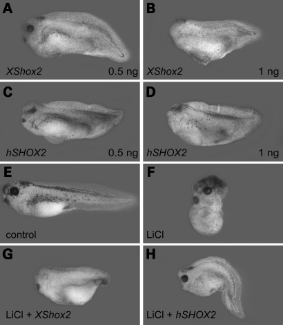 Figure 1. Ectopic Shox2 expression induces a ventralizing effect during early Xenopus development and rescues embryos partially dorsalized by LiCl. Lateral view of stage 36 embryos, radially injected at 4-cell stage with 0.5 ng (A, C) and 1 ng (B, D) Xenopus tropicalis Shox2 RNA (A, B) and human SHOX2a RNA (C, D). Shox2-injected embryos show a dose-dependent ventralizing effect. Uninjected stage 36 control embryo (E) and control embryo treated with 120 mM LiCl (F). Ventral injection of 1 ng Shox2 RNA rescues embryos partially dorsalized by LiCl (G, H).