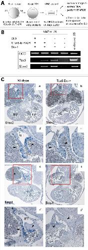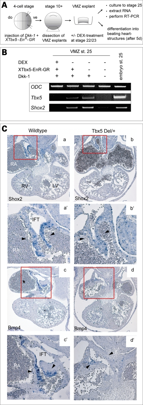 Figure 3. Shox2 mediates Tbx5 expression to Bmp4 signaling in the developing heart. (A) Scheme of the ventral marginal zone (VMZ) experiment. Xenopus embryos were injected (vegetal dorsal) with 1 ng Dkk-1 mRNA and 0.2 ng of XTbx5 EnR-GR DNA into two blastomeres at the 4-cell stage and VMZ explants were dissected at early gastrula stage. Explants were cultured until stage 22/23 and then treated with 0.5 µM dexamethasone (DEX)-solution to activate the injected repressor-construct. RNA was extracted at stage 25 and analysed by RT–RCR for the presence of XTbx5 and XShox2. (B) RT–PCR shows that Dkk-1 induces Tbx5 and Shox2 expression in VMZ explants. XTbx5 EnR-GR abolishes Dkk-1 induced Tbx5 and Shox2 expression after DEX-treatment. Ornithine decarboxylase was used as a loading control. (C) Section in situ hybridization on E11.5 wild-type and Tbx5del/+ mouse hearts. Murine Shox2 is strongly expressed in the inflow tract of the developing heart in wild-type embryos (a), which is markedly decreased in Tbx5del/+ embryos (b). Murine Bmp4 expression overlaps with the Shox2 expression domain in wild-type hearts (c) and is almost absent in Tbx5del/+ embryos (d). RA, right atrium; LA, left atrium; RV, right ventricle; LV, left ventricle.