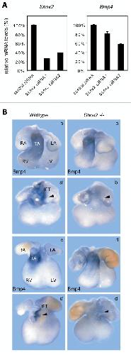 Figure 4. Shox2 deficiency impairs Bmp4 expression. (A) H10 cells were transfected with two different Shox2 siRNAs (Shox2 siRNA1 and Shox2 siRNA2) in parallel with a control siRNA. Expression levels of Shox2 (left panel) and Bmp4 (right panel) were assessed 24 h after transfection by qRT–PCR analysis. siRNA-mediated knock-down of Shox2 results in 19–42% reduction of Bmp4 mRNA levels. All results were normalized to Hprt1 (hypoxanthine phosphoribosyltransferase 1) mRNA values. (B) Whole-mount in situ hybridization on E11.5 (a, b) and E12.5 (c, d) wild-type and Shox2−/− mouse hearts using a Bmp4 RNA probe. Both, ventral (a–d) and dorsal (a′–d′) views are shown. Murine Bmp4 is strongly expressed in the truncus arteriosus (TA) (a, c) and in the inflow tract (a′, c′) of the developing heart in wild-type embryos. In the Shox2−/− mouse hearts, Bmp4 expression is still present in the truncus arteriosus (b, d) but completely absent in the IFT (b′, d′), where Shox2 and Bmp4 expression domains overlap in the wild-type heart. RA, right atrium; LA, left atrium; RV, right ventricle; LV, left ventricle.