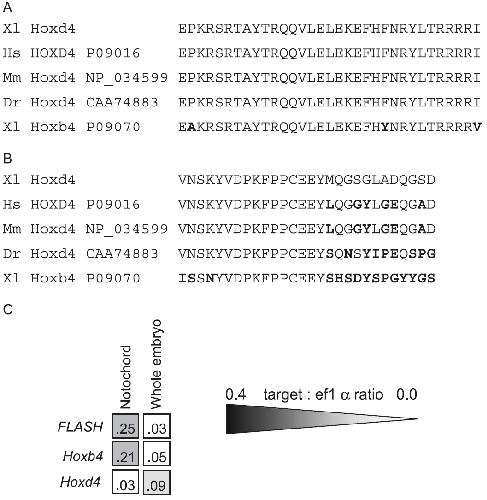 Fig. 4. Hoxd4 is not expressed in the tailbud stage notochord. (A, B) Sequence comparisons of Xenopus HOXD4 and HOXB4 proteins compared to those from
