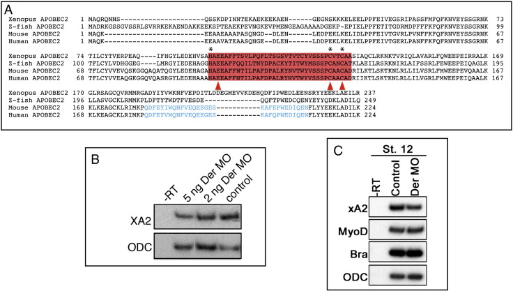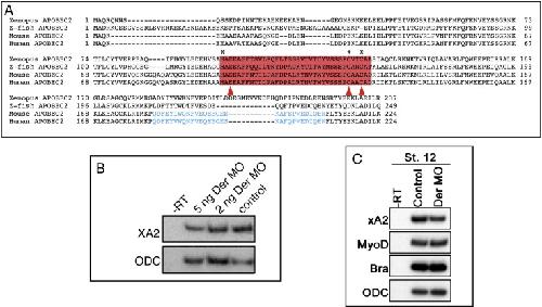 Supplementary Figure 1. Sequence and expression of xA2. (A) Sequence of Xenopus, mouse, and zebrafish APOBEC2, and human APOBEC1. The active site ofAPOBEC1 is boxed. Active center residues, where H100, C130 and C134 coordinate Zn, are labeled with asterisks, and residues mutated in MutXA2 are indicated by red arrowheads. (B, C) xA2 expression is decreased in stage 18 posterior poles (B, 2 and 5 ng Der MO) and stage 12 dorsal halves (C, 5 ng Der MO) of Xenopus embryos depleted of Derriere protein. RT-PCR with ODC as loading control. |