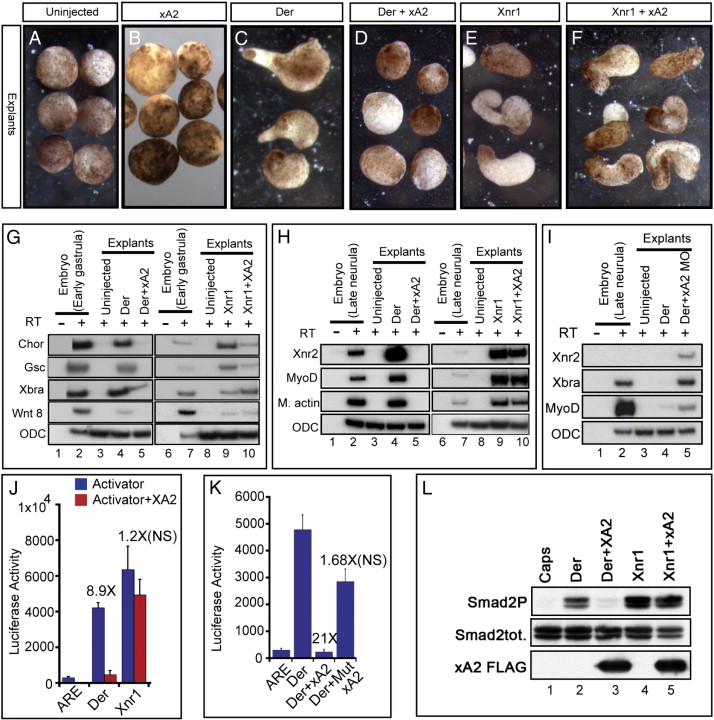 Fig. 4. APOBEC2 is a TGFβ inhibitor in Xenopus. (AâF) xA2 prevents cap elongation induced by derrière but not Xnr1. RNAs were injected in the animal poles of 2 cell stage embryos (xA2 2 ng, derrière 200 pg, Xnr1 30 pg). Caps were explanted at stage 10 and cultured to stage 18. (G, H) Expression of xA2 RNA represses derrière-, but not Xnr1-dependent gene induction. RT-PCR of early gastrula (G) and late neurula (H) stage animal caps injected with derrière RNA (200 pg), or Xnr1 RNA (20 pg), with or without xA2 RNA (2 ng). (I) xA2 depletion increased mesoderm induction by derrière RNA. RT-PCR for mesodermal genes (Xnr2, Xbra and MyoD), with ODC as loading control, in stage 18 animal caps injected with derrière RNA (100 pg) and xA2 MO (10 ng). (J) xA2 specifically inhibits Derrière-induced transcription. Transcription assays for the Activin/nodal reporter ARE. Transcriptional inhibition by xA2 was statistically significant with derrière (200 pg RNA), but not with Xnr1 (20 pg RNA). (K) An intact putative deaminase domain is required for the inhibitory activity of xA2. Wild-type, but not the triple mutant xA2 (Mut xA2, 2 ng RNA), inhibited transcription induced by derrière (200 pg RNA). Only the difference in transcriptional activity induced by Derrière alone vs. Derrière + xA2 wild-type was statistically significant (P < 0.001). (L) xA2 blocks the C-terminal phosphorylation of endogenous Smad2/3 induced by derrière. Western blot for total Smad2/3 and C-terminally phosphorylated Smad2/3 in stage 10.5 animal caps. No effect was seen on total Smad2/3 protein levels. |