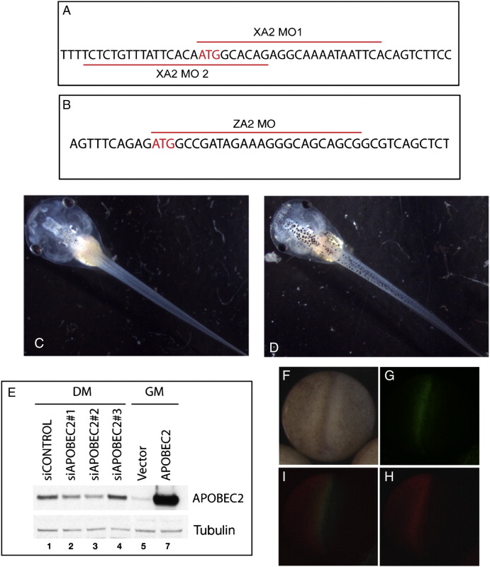 Supplementary Figure 2. (AâE) Blocking reagents for Xenopus, zebrafish, and mouse apobec2. (A) Sequence of the two morpholino oligonucleotides for Xenopus A2 depletion. (B) Sequence of the morpholino oligonucleotide for zebrafish A2 depletion. (C, D) Unilateral PM injection of XA2 MO (10 ng) does not affect antero-posterior development. Dorsal views of control (C) and XA2 MO injection in left PM (D). (E) Effect of different siRNAs (1â3) against mouse A2 mRNA on expression of A2 protein levels in C2C12 cells. siA2.2 was chosen for the experiments in Fig. 5. DM: differentiation medium, GM: growth medium. Lanes 1â5: endogenous A2. Lane 7: overexpressed A2 (CMV-APOBEC2 transfection). Western blot for mouse A2 and tubulin. (FâI) Targeted injections for PM and LPM. Embryos injected at the 4 cell stage with fluorescent control MO (lateral subequatorial in the dorsal left blastomere, G) and Cherry-H2B (lateral subequatorial in the ventral left blastomere, H) were fixed at stage 20. Dorsal views, posterior is down. The same embryo in visible (F), green UV channel (G), red UV channel (H), and overlap of green and red (I). |