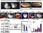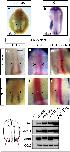 Supplementary Figure 3. A. xA2 MO coinjected with Xnr1 RNA (1 pg) in left PM. B., C. Xnr1 RNA does not rescue expression of Lefty in the left LPM of xA2-depleted embryos. Double in situ hybridization for Lefty (purple) and injected LacZ RNA (red). Lefty is absent in the left LPM but increased in the midline. B is a left lateral view, C is a dorsal view. Anterior is to the left. D-I. Xnr1 RNA and xA2 MO synergize to increase MyoD expression at stage 18. Double In situ hybridization for MyoD (purple) and LacZ (red) as tracer. D., F., H are dorsal views, anterior to the left. E, G, I are posterior fragments of the same embryos sectioned transversally. xA2 MO alone increased MyoD expression on the injected side stained with Fast Red in addition to the markers stain (n = 25, D, E). Xnr1 RNA alone (1 pg) had no effect (n = 32, F, G), while the combination of RNA and MO significantly increased the lateral expansion of MyoD (n = 29, H, I) and produced a blastopore closure defect (H, right side). Bars in D, F, H indicate the plane of the transversal section. J. Depletion of xA2 protein reduces expression of Xnr1 in posterior mesoderm. RT-PCR for the indicated genes in dorsal posterior fragments of stage 18 embryos. 10 ng xA2MO were injected at the 4 cell stage and targeted at the paraxial mesoderm. K. Expression of the triple mutant xA2 and wild-type tagged xA2 proteins were equal. Embryos (stage 24) were injected with 4 ng RNA and collected at stage 10. L. xA2 does not inhibit the Wnt pathway. Embryos were injected with Siamois reporter gene and Wnt8 RNA (50 pg)+/- xA2 RNA (2ng). Statistical significance was calculated with Studentâs t test. M. xA2 is an inhibitor specific for Derrière. The ARE reporter gene (100 pg) was activated by coinjected derrière (100 pg), Xnr2 (5 pg), Xnr4 (50 pg), Xnr5 (0.1 pg), or Activin (100pg) RNA, with or without xA2 RNA (2 ng) at the 4 cell stage and measured at stage 10.5. xA2 overexpression had a significant effect only on Derrière activity (Studentâs t test). |